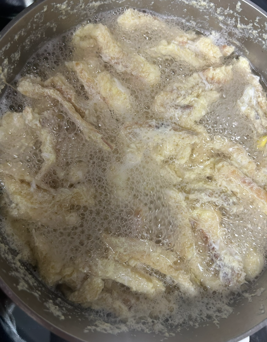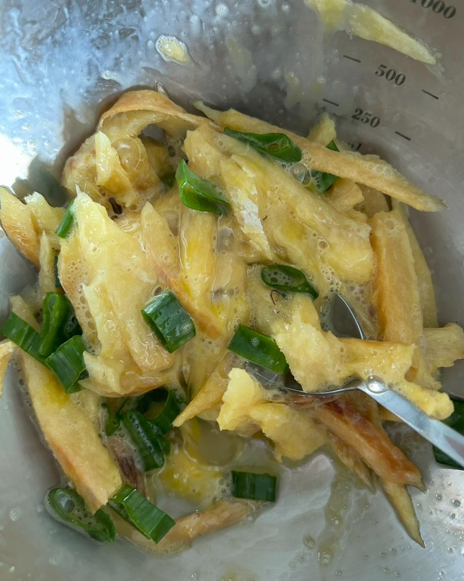 -달걀 세 개와 황태채에 뒤적뒤적 입혀준다. 이때 소금과 후추로 살짝 간을 하거나 혹은 패스해도 된다.