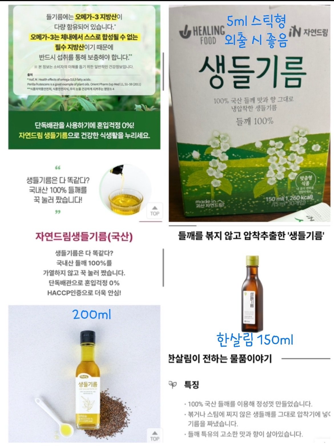 들깨를 볶지 않고 냉압착한 생들기름은 150-200ml 정도의 소용량을 사서 대체로 한 달 안에 먹는다. 한살림이나 자연드림에서 구입하고, 장거리 외출을 할 때는 먹거리에 제한이 있어서 애써 스틱형 제품을 챙긴다.
