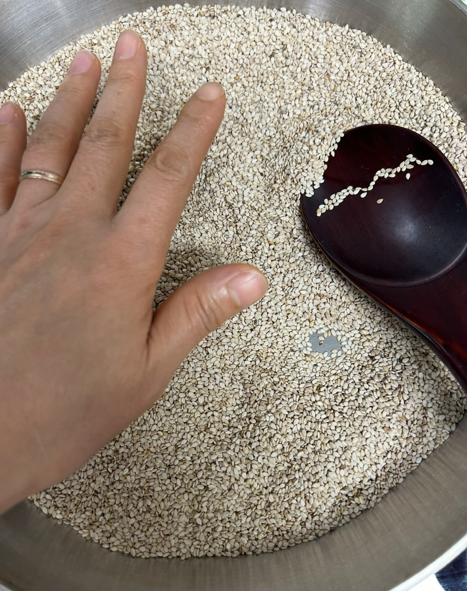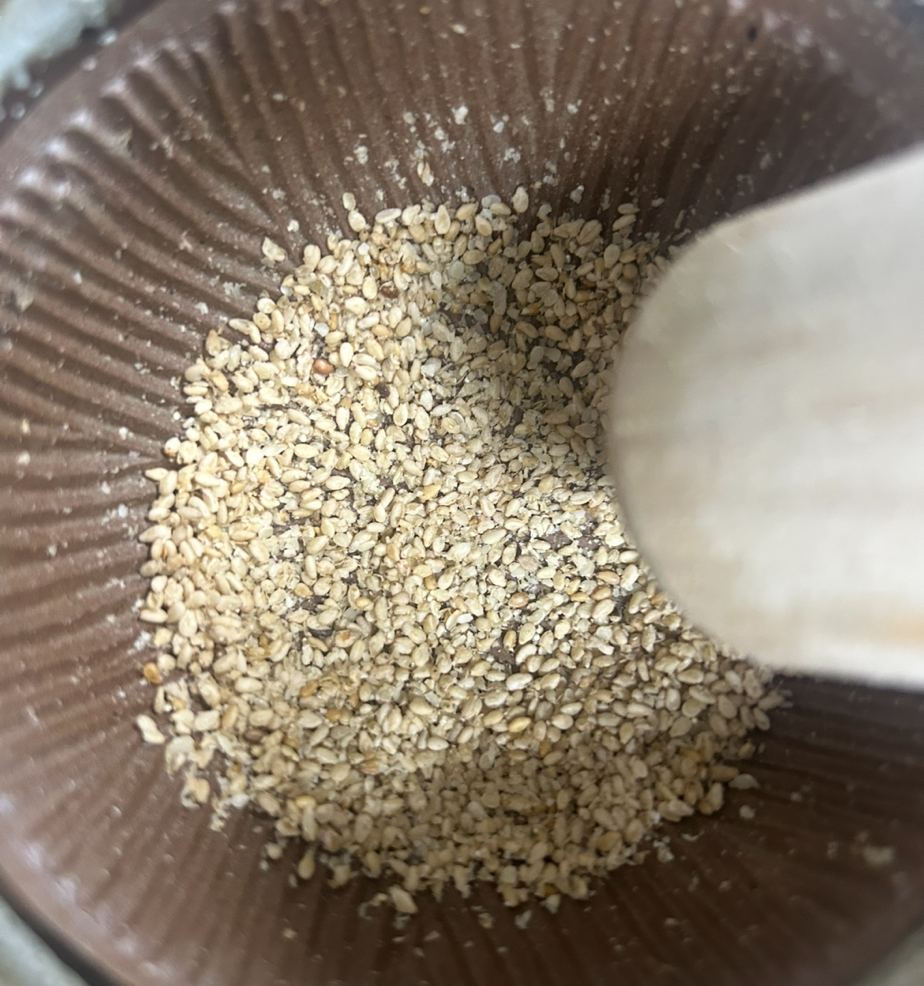 엄지와 검지로 밀듯이 부드럽게 으깨어지면 완성이다. 먹을 때마다 매번 절구에 드르륵 몇 번이면 참깨의 고소함이 더해진다.