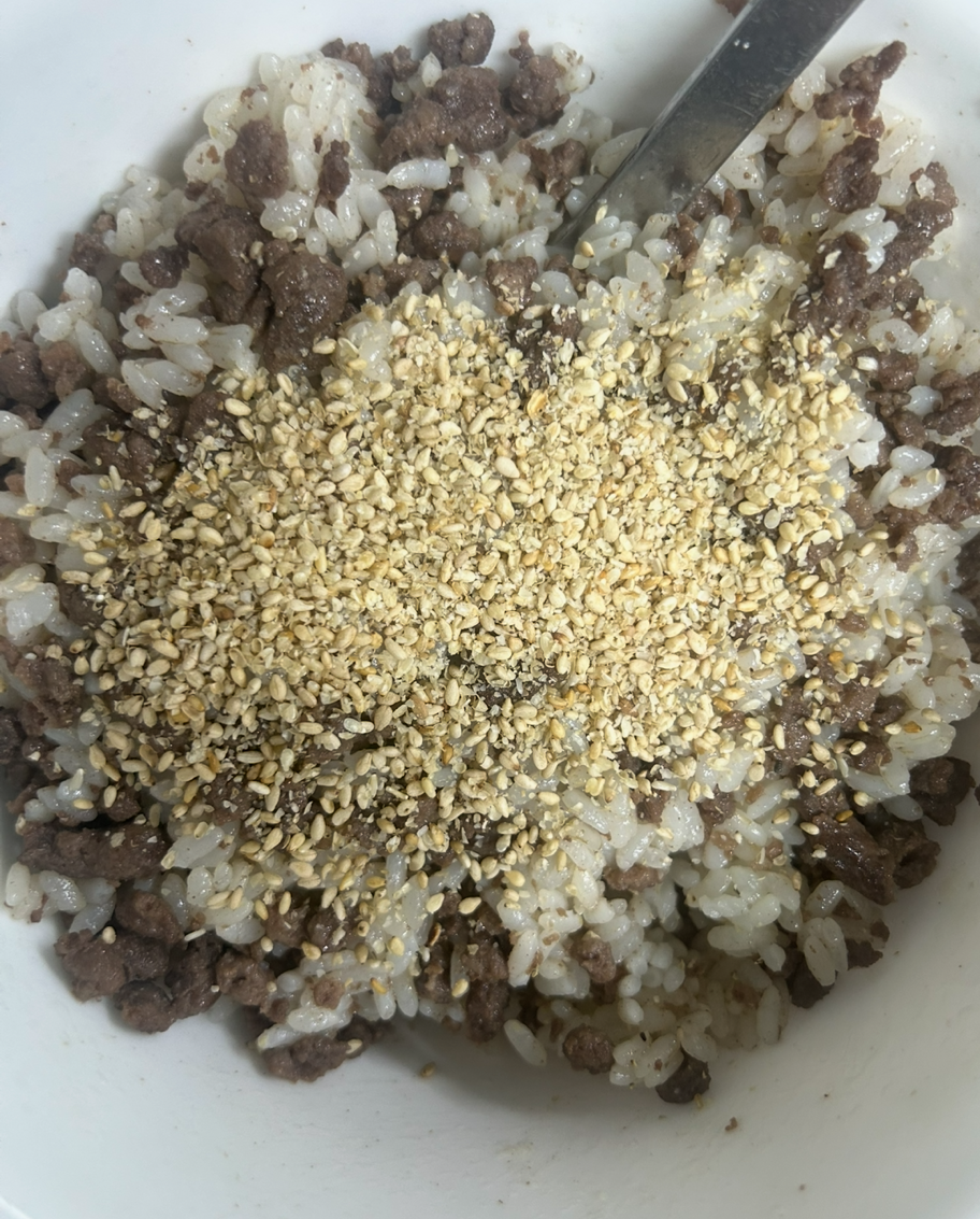 떡갈비와 소고기 주먹밥에도 절구를 거친 참깨를 넣어주고 통깨도 한 번 더 뿌려준다. 요리할 때 나도 모르게 미소가 지어지는 순간이다.