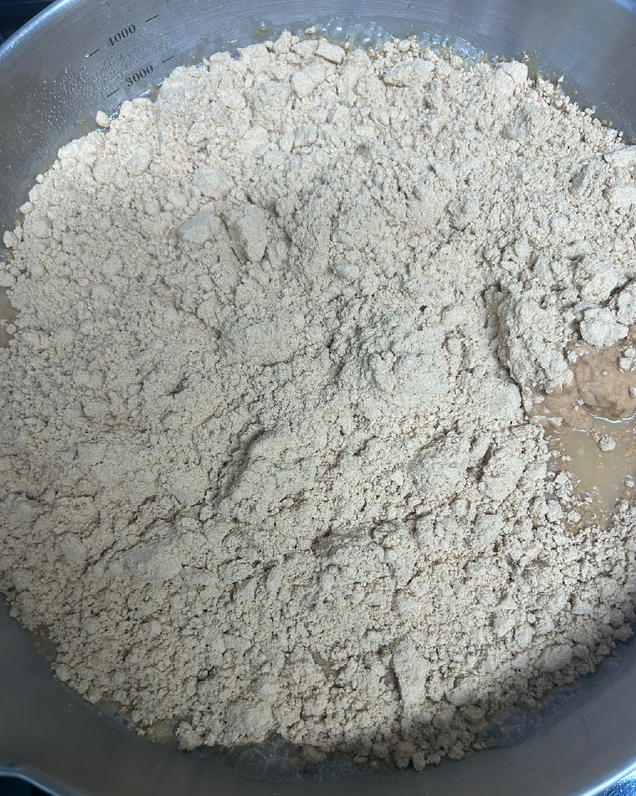 대충 뒷정리를 하고 한숨 돌리며 보자기를 펴고 바닥으로 내려왔다. 본격적으로 섞어보려던 순간을 운동 다녀온 남편이 찍어줬다. 내 것보다 조금 되직한데 나중에 먹을 때 손 봐도 되니 일단 그냥 두려고 한다.