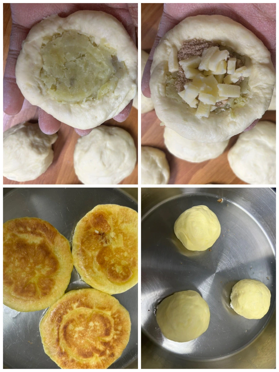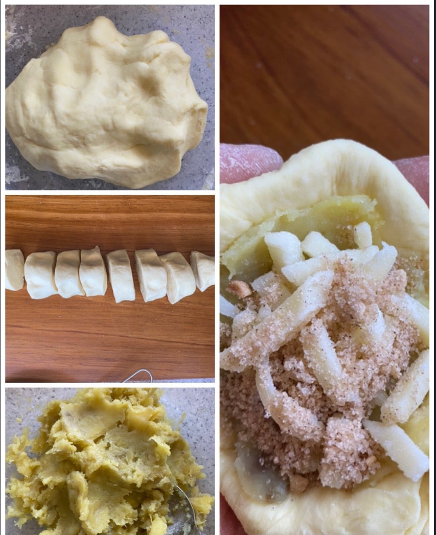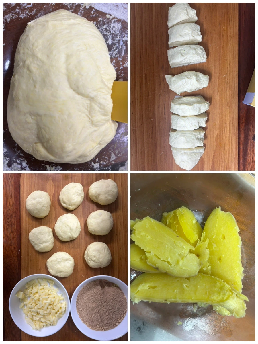 -반죽에 으깬 찐 고구마를 한 숟가락, 잼믹스, 치즈를 넣고 동그랗게 만든다.