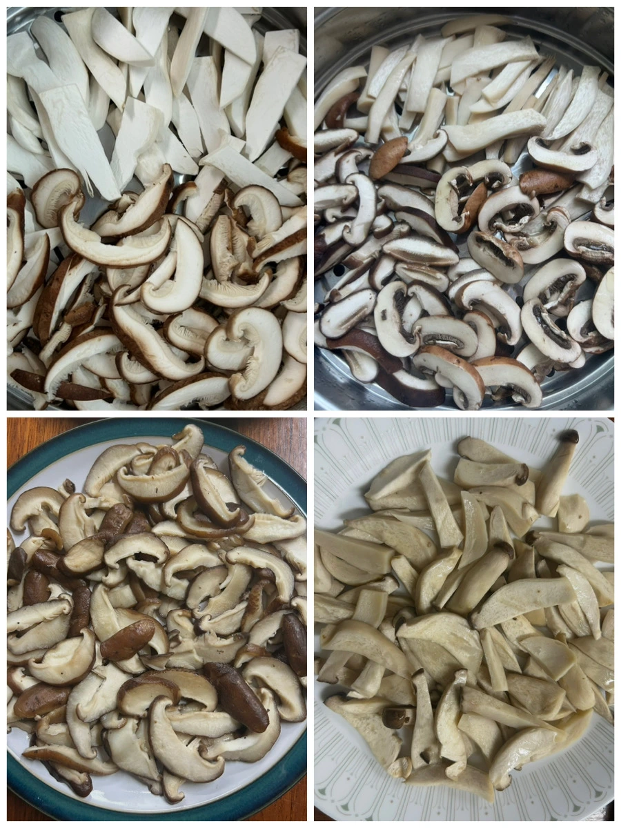 표고버섯과 새송이버섯을 채 썰어 찐다.