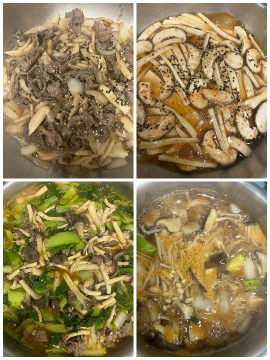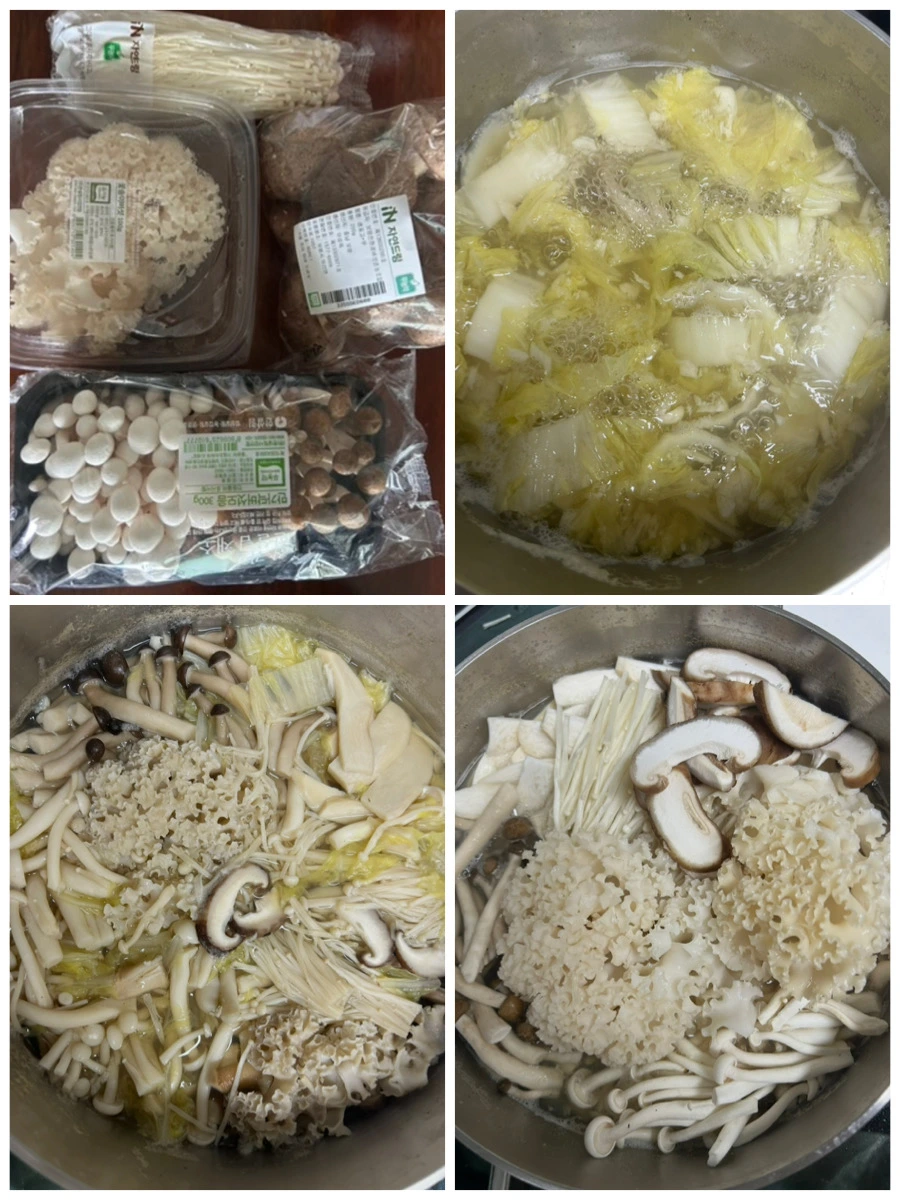 배추를 먼저 넣어 한번 끓여주고, 준비한 버섯을 올려 전골을 끓인다. 국간장과 마늘, 소금 후추면 충분하다.