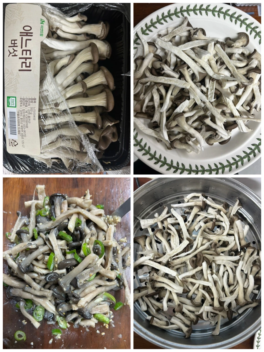느타리버섯을 찐 후 물기를 짜고 간장과 마늘, 파를 넣어 무침을 한다.