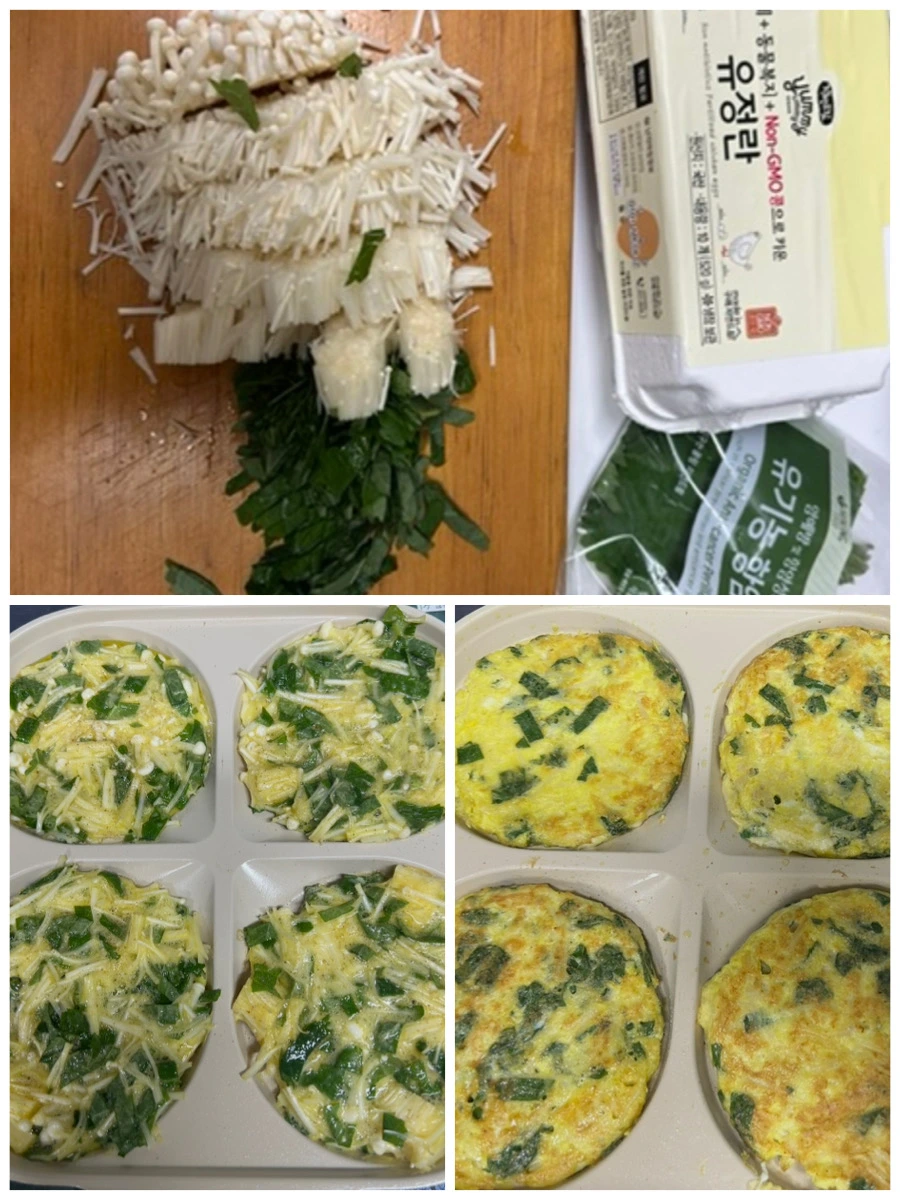 팽이버섯과 깻잎, 달걀로 부침을 한다. 고소함과 향이 좋아 점심 반찬으로 좋다.