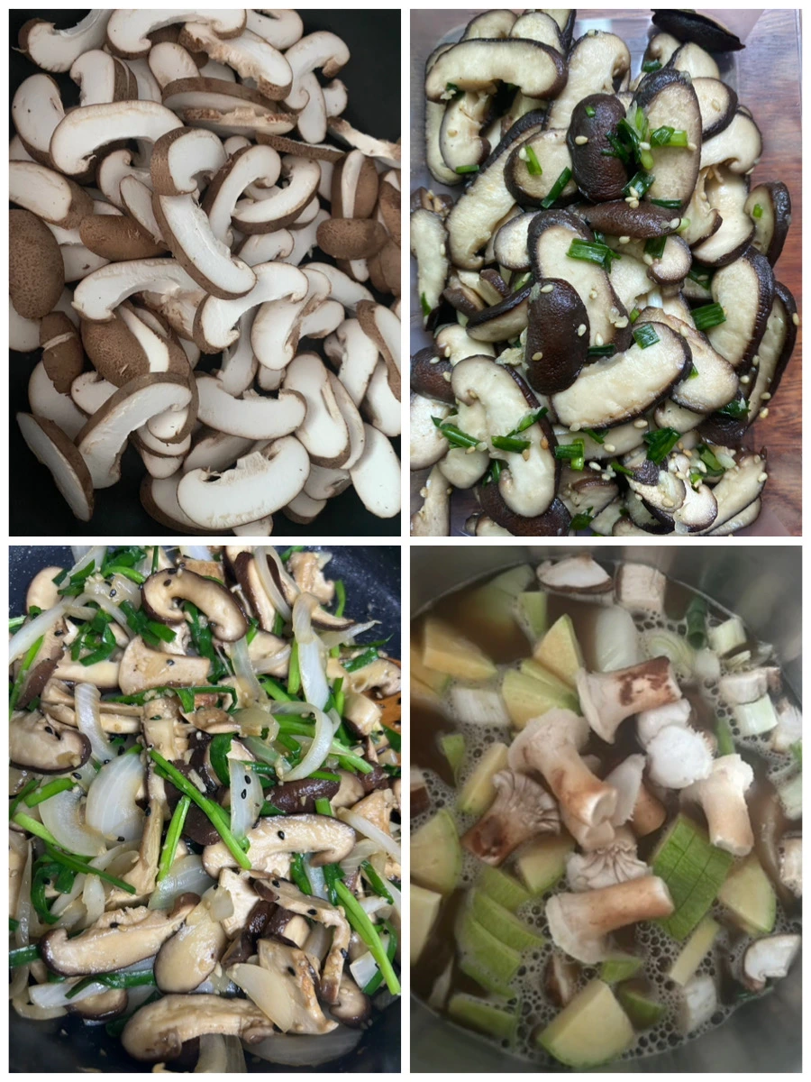 표고버섯을 쪄서 무치거나, 양파와 부추로 볶음을 한다. 기둥은 된장찌개나 청국장에 넣는다.