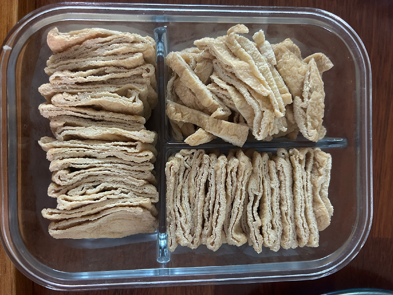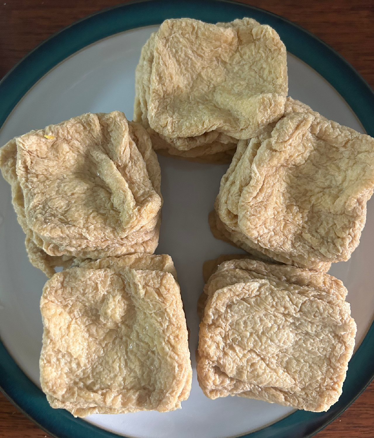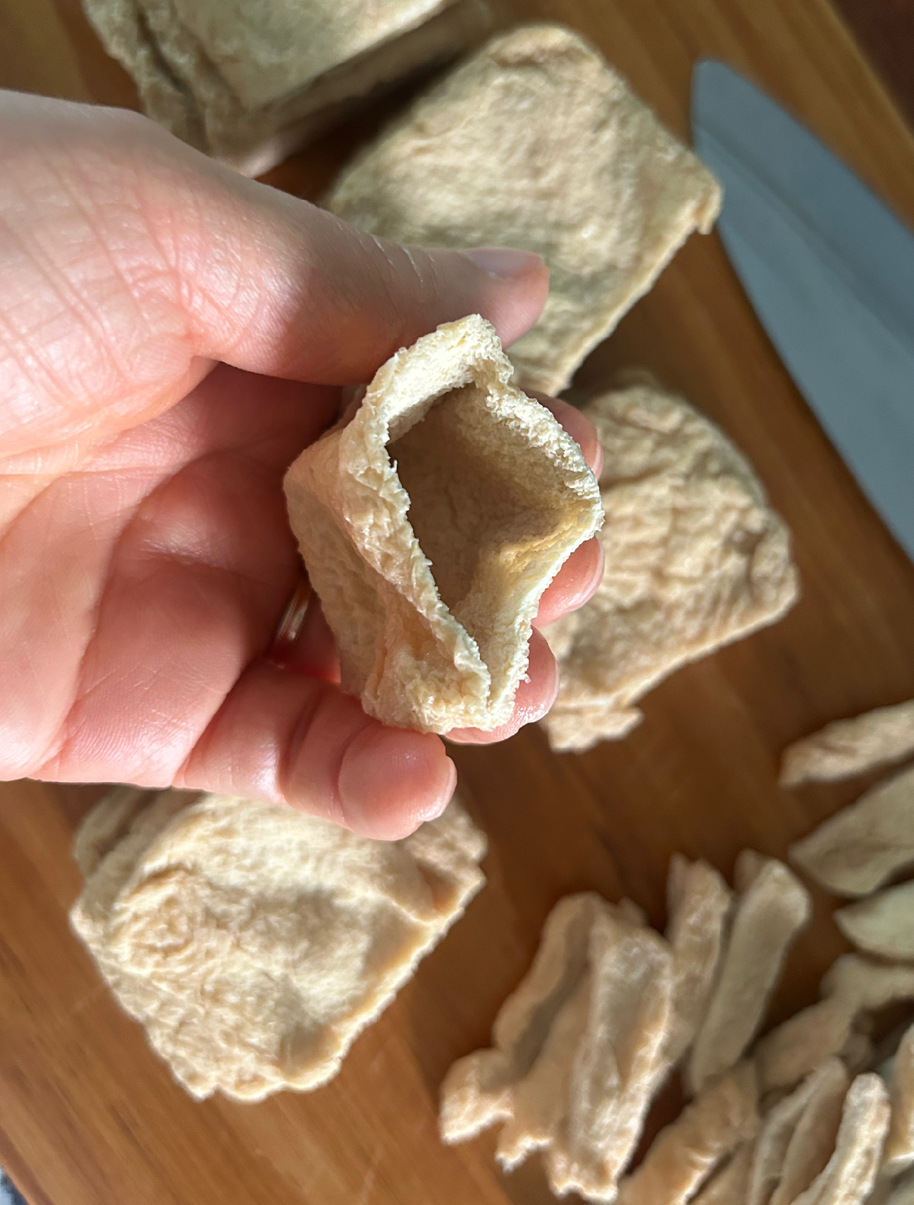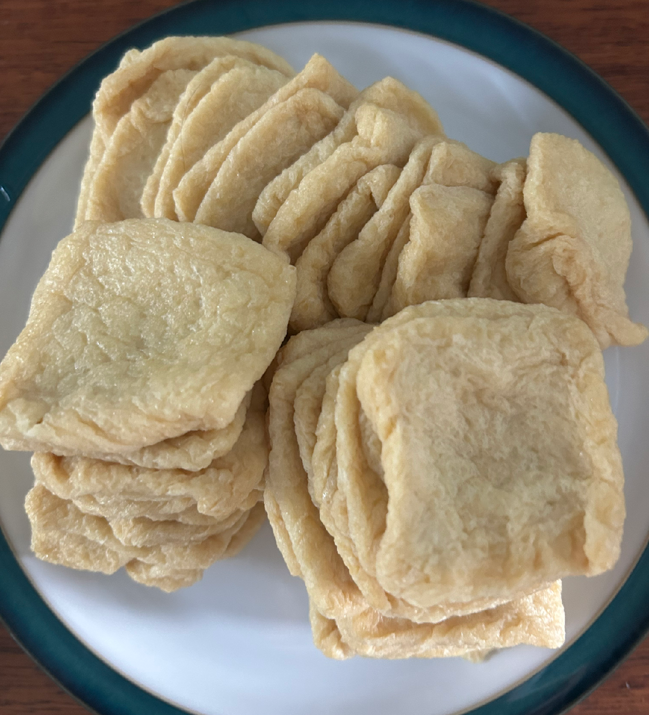 시판 유부는 두께가 있어 밥을 넣은 후에도 형태가 안정적이다. 그런데 이 유부는 그정도가 아니라서 세모보다는 네모 모양을 추천한다. 고명을 올리기에도 넉넉해서 좋다.
