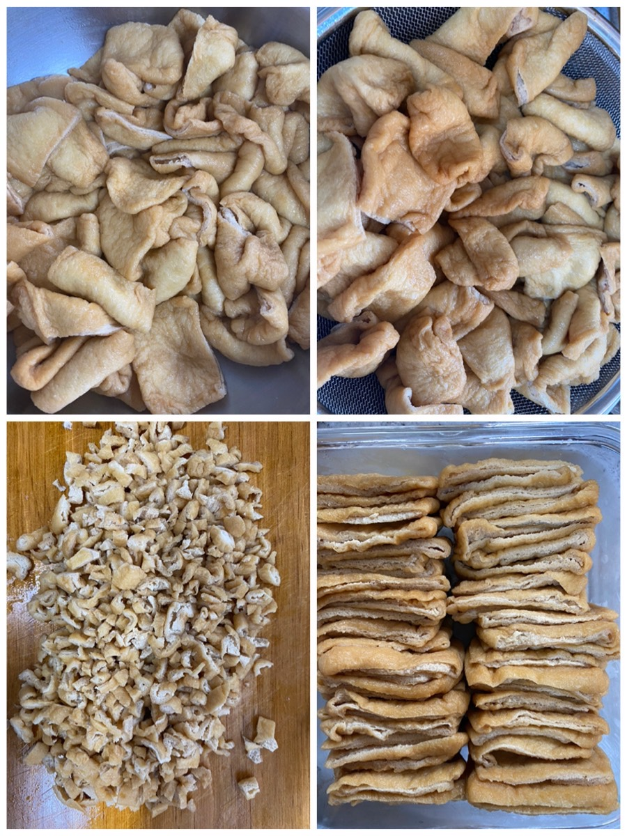 -유부를 꼭 짠 후 한 장씩 펼친다.
