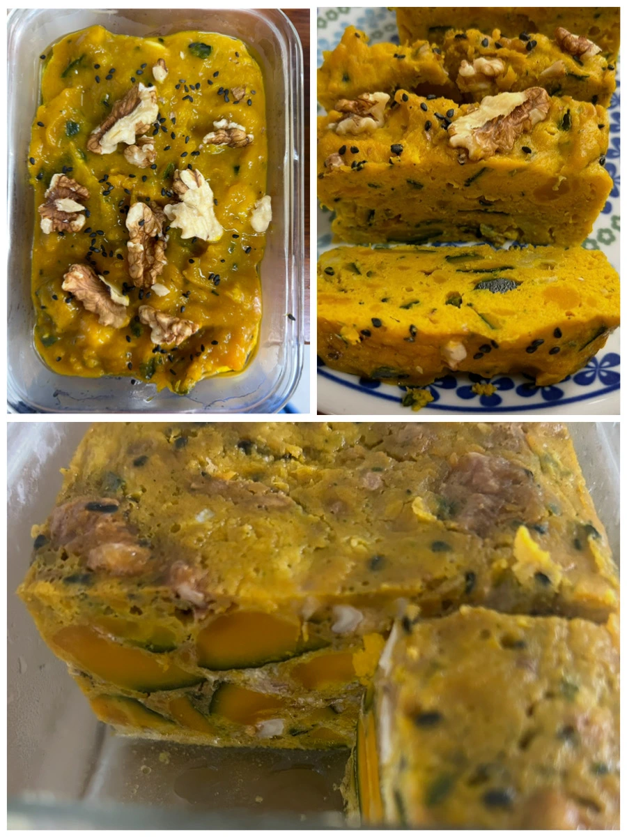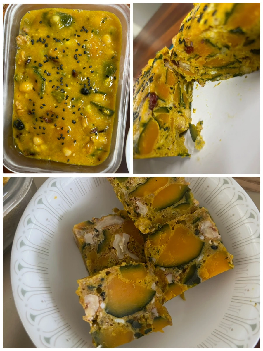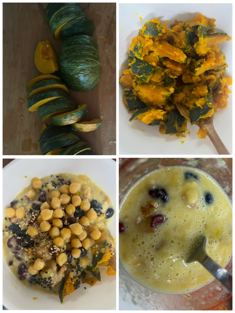 *준비물: 단호박 1개, 잘 익은 바나나 1개, 달걀 1-2개 호두와 아몬드 혹은 삶은 병아리콩, 유기농 크렌베리
