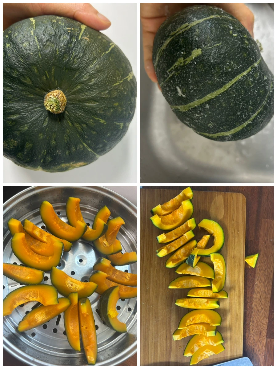 -반을 잘라 씨를 파내고 적당한 크기로 자른 후 김이 오른 찜기에 넣는다.