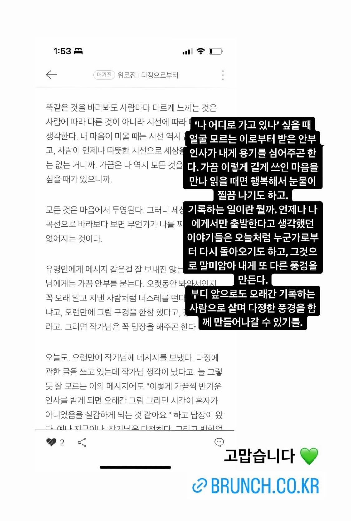 친분이 없는 사람에게 메시지 같은걸 잘 보내진 않는데 이 작가님에게는 가끔 안부를 묻는다. 오랫동안 봐와서인지 꼭 오래 알고 지낸 사람처럼 너스레를 떤다. 잘 지내시냐고, 오랜만에 그림 구경을 한참 했다고, 좋은 밤 되시라고. 그러면 작가님은 꼭 답장을 해주곤 한다.