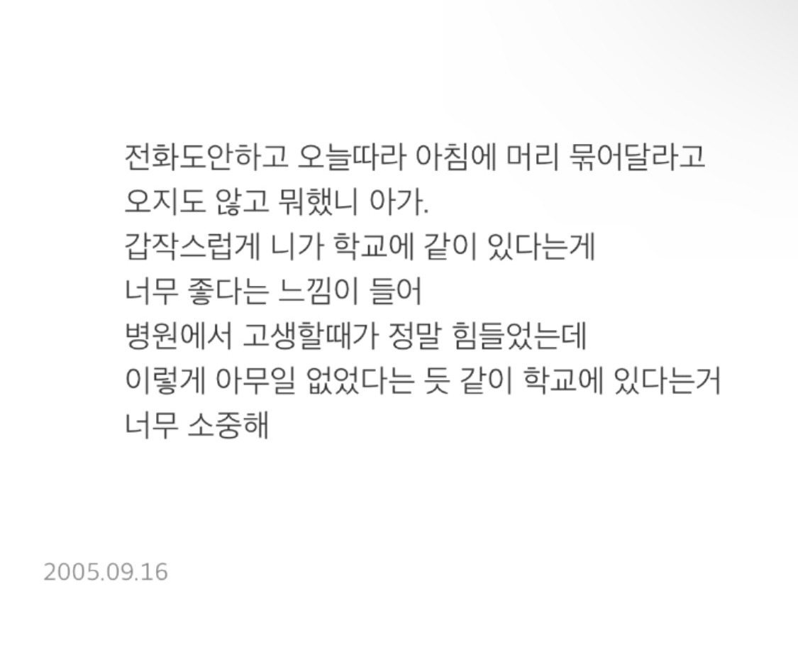 라는 대화를 하며 두 계절을 보냈지요. 그때에는 병명도 제대로 나오지 않아서 백혈병이다 뭐다 여러 병을 예상하며 참 많은 검사를 했고, 그것만으로도 많이 지쳤지만 다시 학교로 돌아가겠다는 생각으로 버틴 것 같아요. 제게는 석식시간에 저녁 안 먹고 병실에 와서 내 밥을 뺏어먹고는 얼굴 보고 다시 야자 하러 돌아가던 친구들이 있었으니까요.