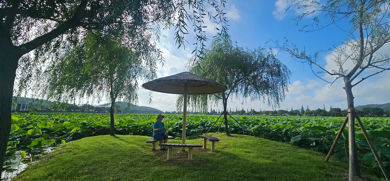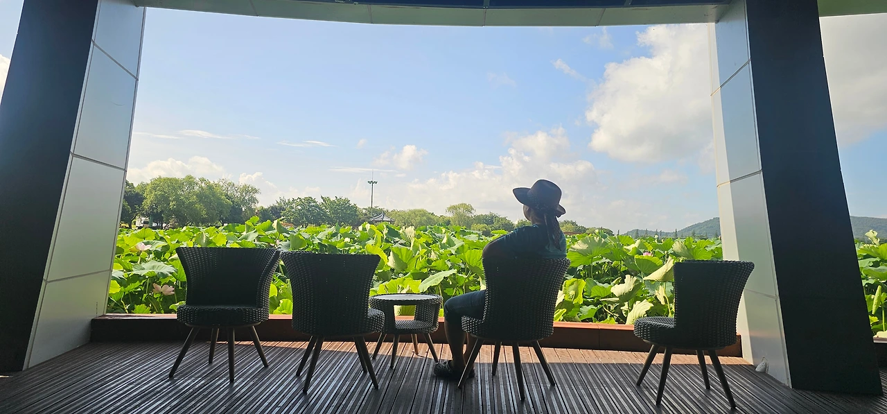 그리고 카페 앞 연잎과 하늘을 바라보며 경치 멍에 빠집니다. 아직은 바람이 시원하긴 한데 더위가 몰려오면 우리는 명옥헌으로 갔다가 집으로 갈 예정입니다.