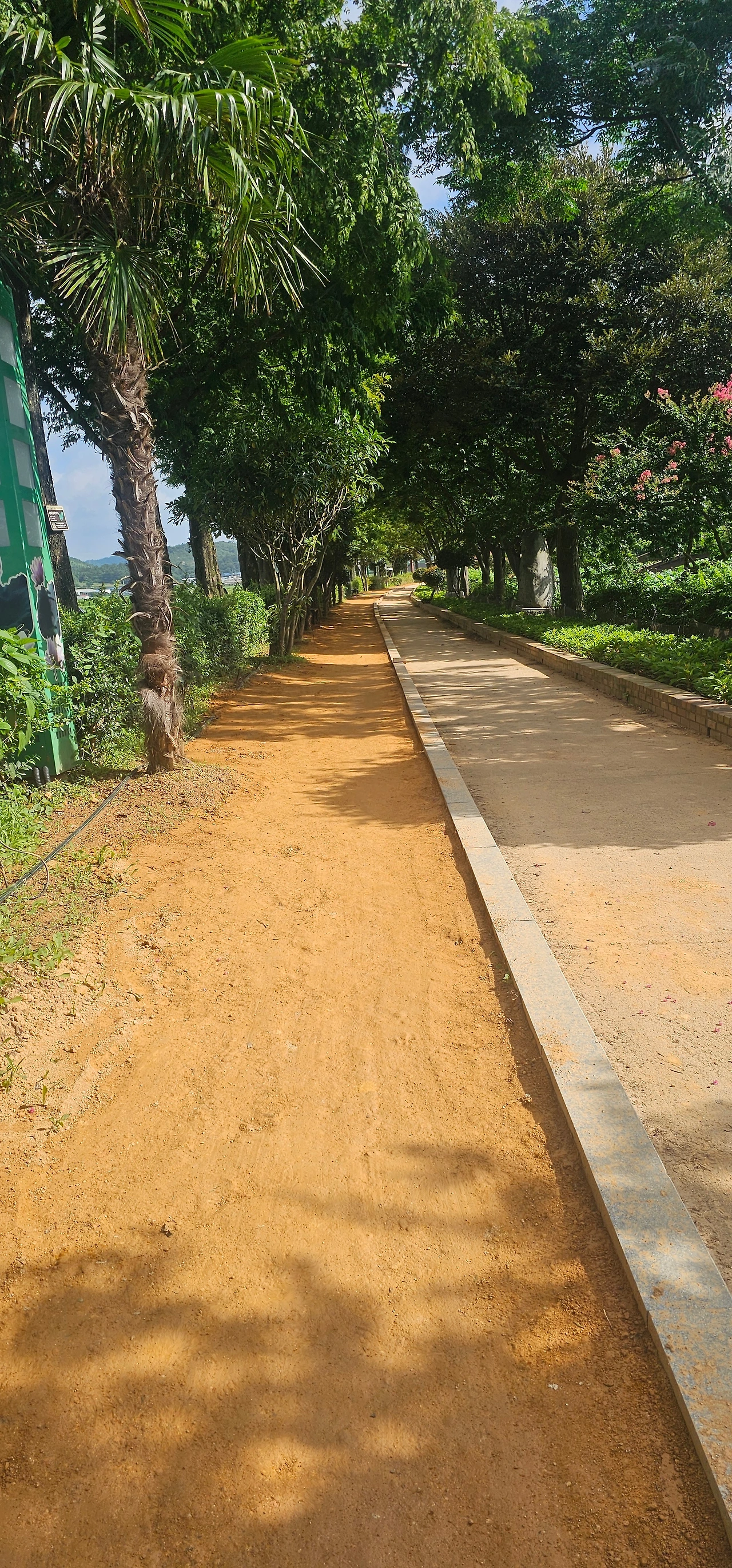 신발을 벗고 황톳길을 맨발로 걸어봅니다. 발밑에 닿는 찬 촉감이 좋습니다.