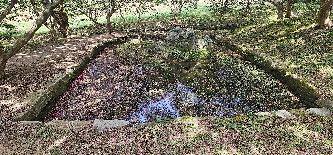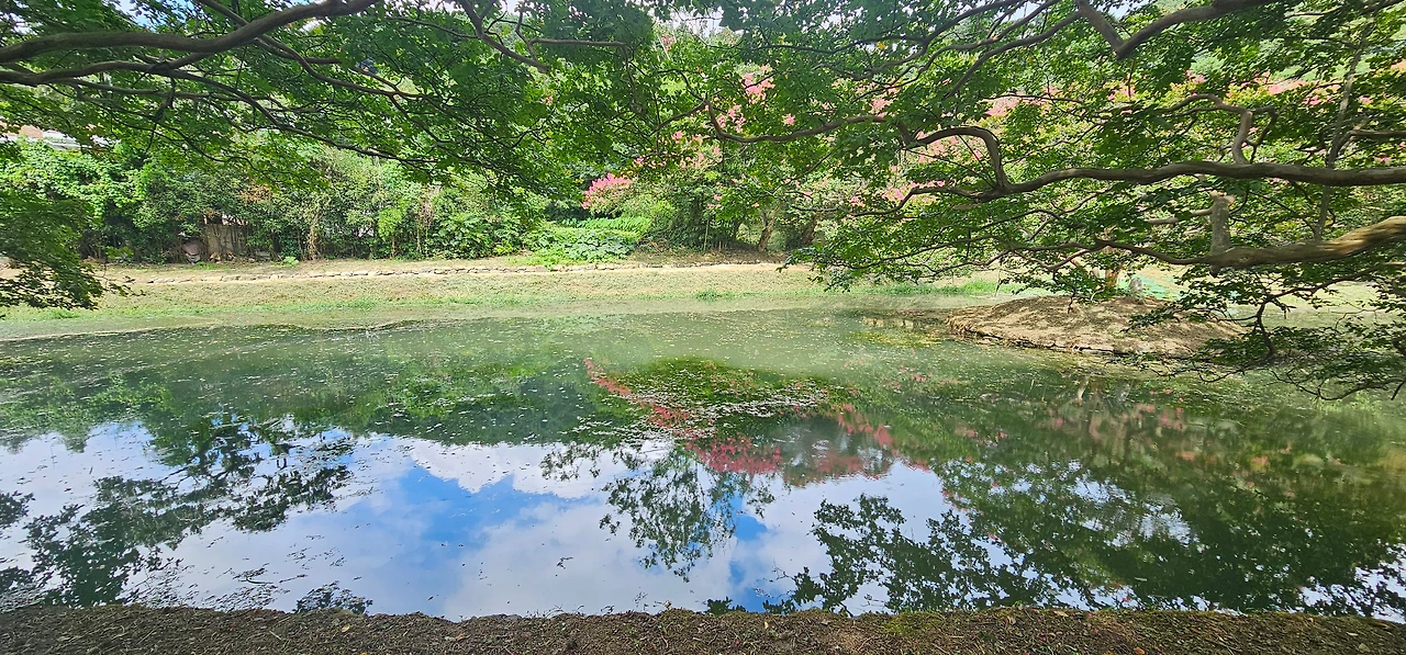 배롱나무길을 따라 올라온 이곳은 위쪽 연못입니다. 명옥헌 정자보다 위쪽에 있습니다. 주변의 물길을 끌어 모아서 아래 큰 면못으로 보냅니다. 배롱나무는 너무 카가 커서 연못과 함께 담아내지는 못하였습니다.
