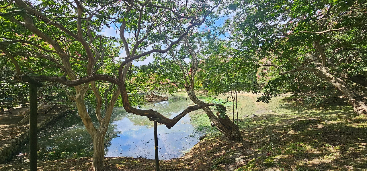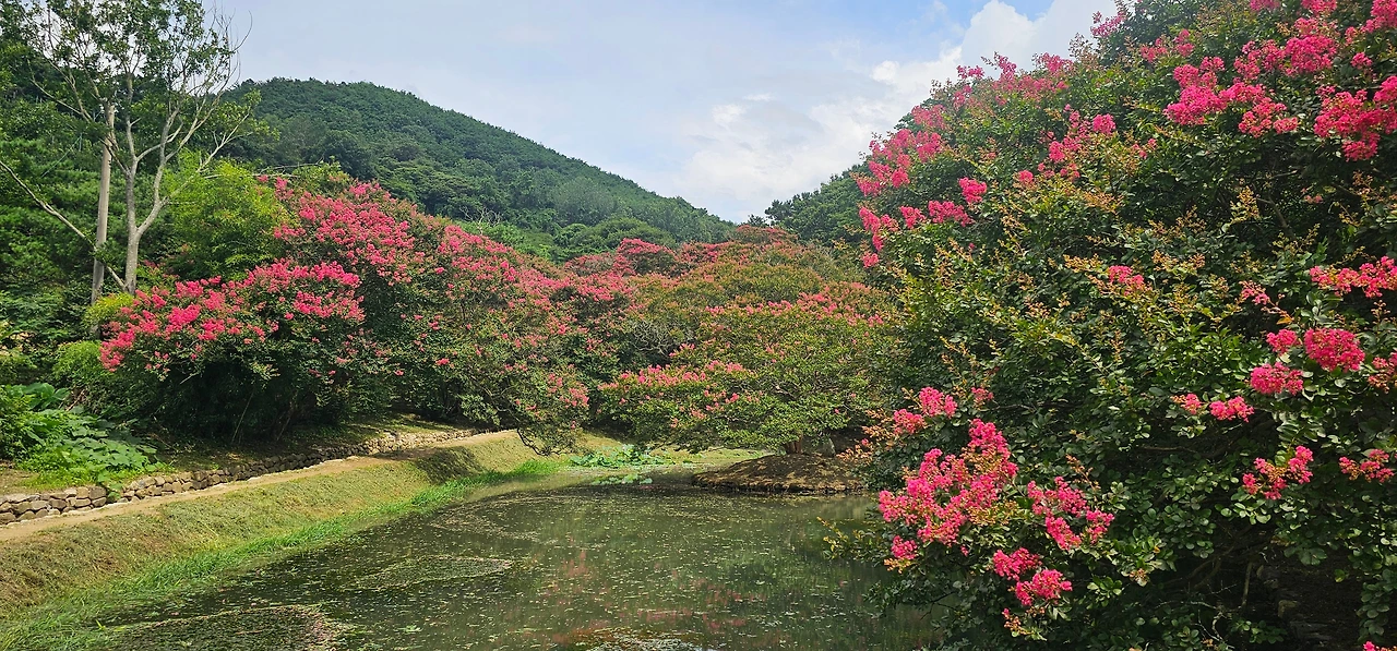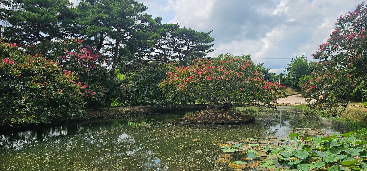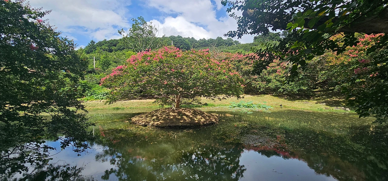 연못가운데는 섬이 있고 잘 가꾸어진 배롱나무가 선홍색 꽃을 피우고 있습니다.