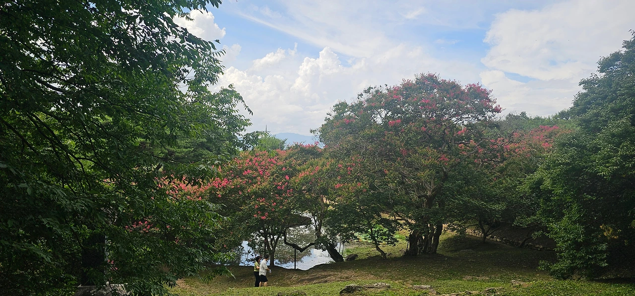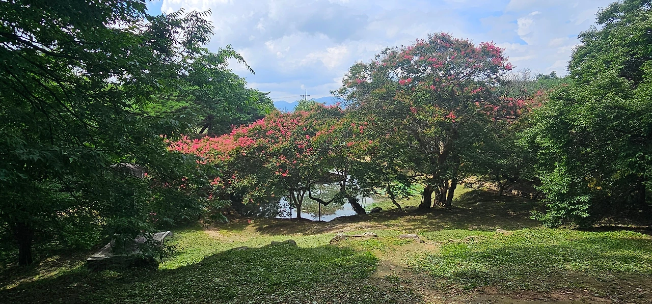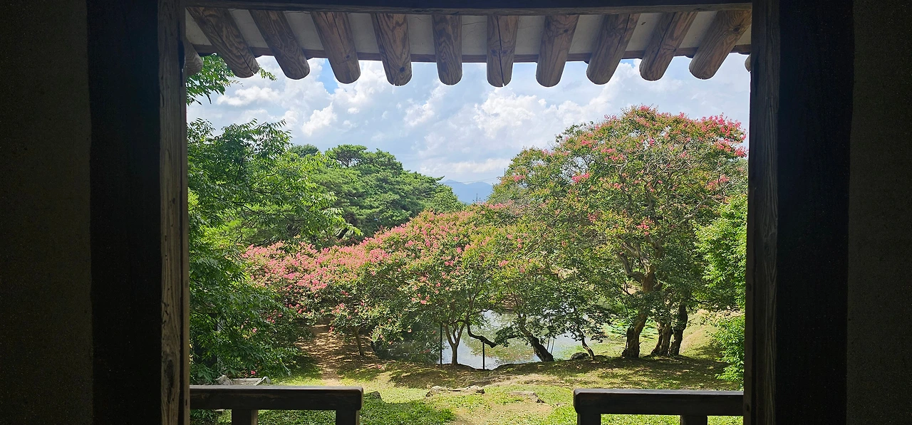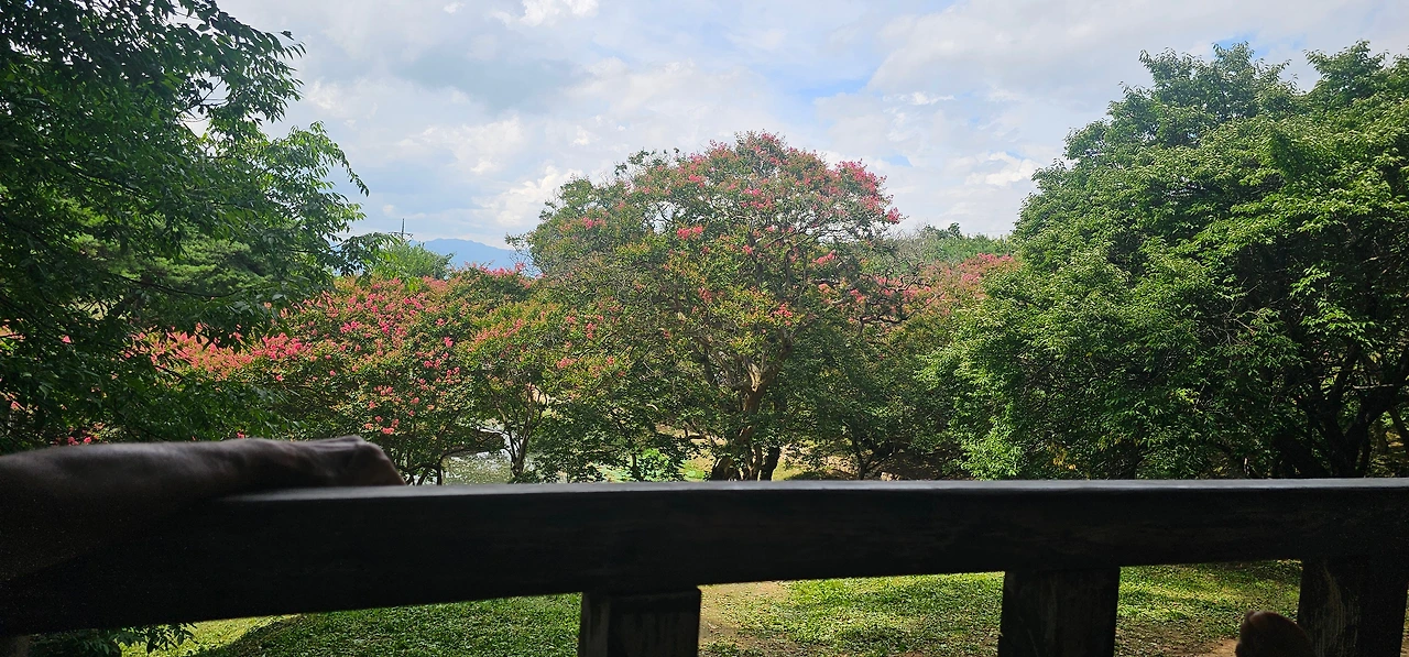 250년전 그때 이곳을 찾은 선비들보다 훨씬 고풍스럽고 더 아름다운 배롱나무를 볼 수 있고 그분들처럼 이 정자를 향유할 수 있음에 감사드립니다. 이 아름다운 풍경에 넋을 잃고 앉아있는데 고마운 바람도 붑니다. 다른 인간 세상보다는 시원한 선계입니다.