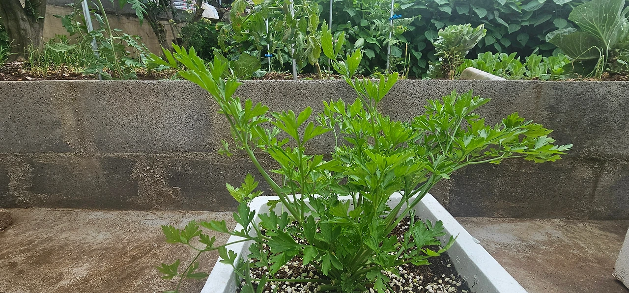 양배추, 상추, 부추, 대파, 쪽파, 당근, 고추, 가지, 오이, 토마토, 참외, 고구마, 깻잎, 바질, 파슬리, 생강, 박하, 민트, 로즈메리, 방아, 당귀입니다.