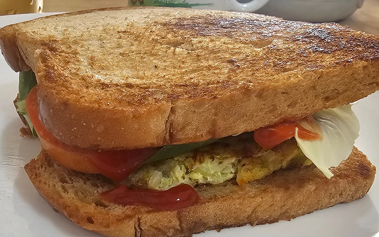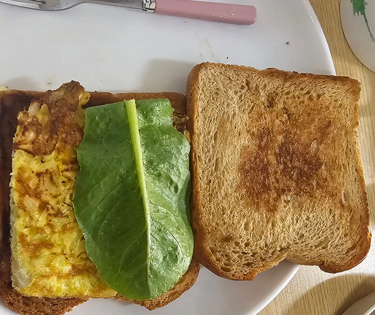 양배추양파계란패티아침 식사 샌드위치입니다. 저는 아침 일어나자마자 텃밭으로 나가 양배추와 로메인 상추를 수확해 옵니다. 양배추는 맨 바깥잎 3장을 뜯어옵니다. 25개 정도 있으니 성장하는 데는 지장이 없습니다. 한 달쯤 있으면 정말 결구될 거예요. 그때는 양배추를 채 썰어 샐러드로 만들어 먹습니다.