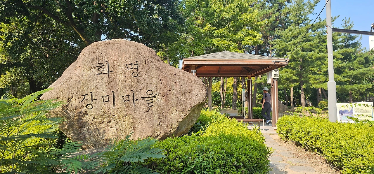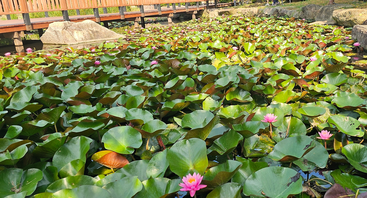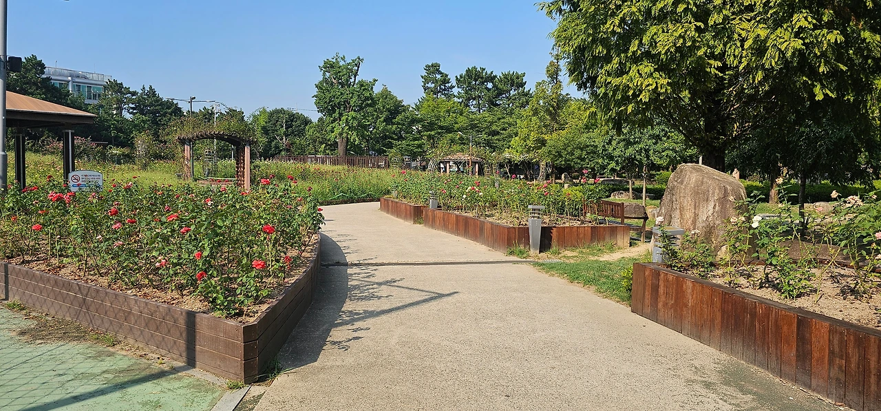 장미공원은 가장자리에 그늘 길이 있고 벤치가 잘 만들어져 있어 화명동 주민의 휴식 공간입니다. 부지런히 걷는 사람들과 그늘에 앉아 휴식하는 사람들이 있습니다. 장미가 필 때는 너무 아름다운 곳입니다. 장미도 아직 있어요. 한창때 모습은 아니지만요. 연못이 하나 있는데 지금은 붉은 수련이 환하게 피어 있어요. 그늘에 앉아서 힐링하고 싶지만 늦기 전에 산책길로 갑니다.