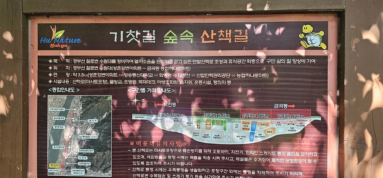 부산 화명동, 20년 동안 살았던 곳이라 내 손바닥 안에 있습니다. 운동하기 좋은 곳이 많지만 오늘은 맨발 걷기 숲길이 조성되어 있는 기찻길숲길 산책로로 갑니다. 가는 길에 있는 도심 숲도 거쳐갑니다.