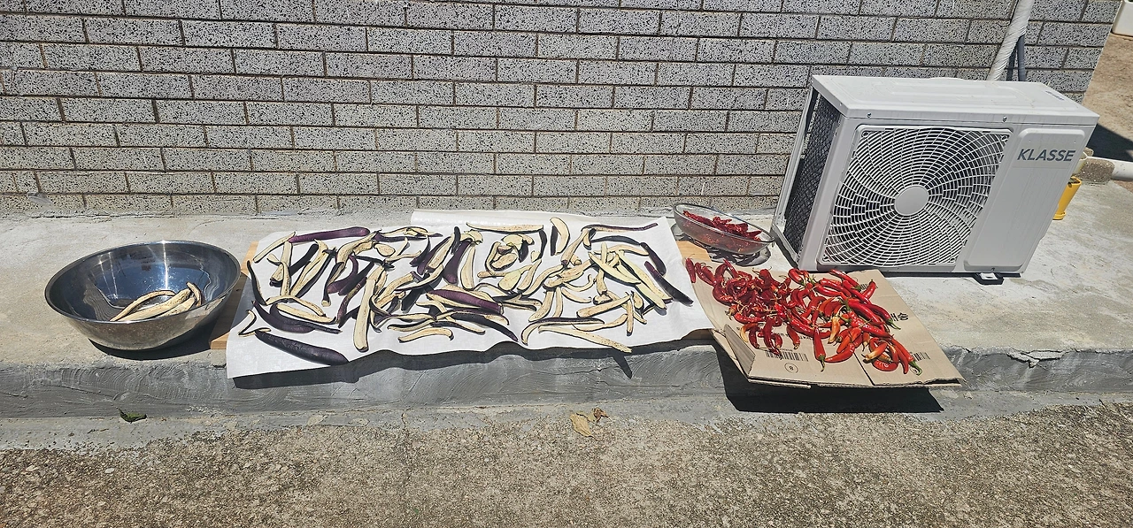 어느새 가지 나보다 더 크게 자랐고 땅에서부터 내 이마까지 가지마다 열매를 달고 있었다. 전부 소비할 방법이 없어 모임날 친구들에게 필요하면 갔다 주겠다고 했는데 달라는 사람은 1명밖에 없었다. 한 바구니 가득 딴 것을 10개 정도는 친구 주려고 챙기고 나머지는 썰어 말렸다. 건나물이 요리에 이용될지는 모르지만 아까와서 버릴 수는 없었다.