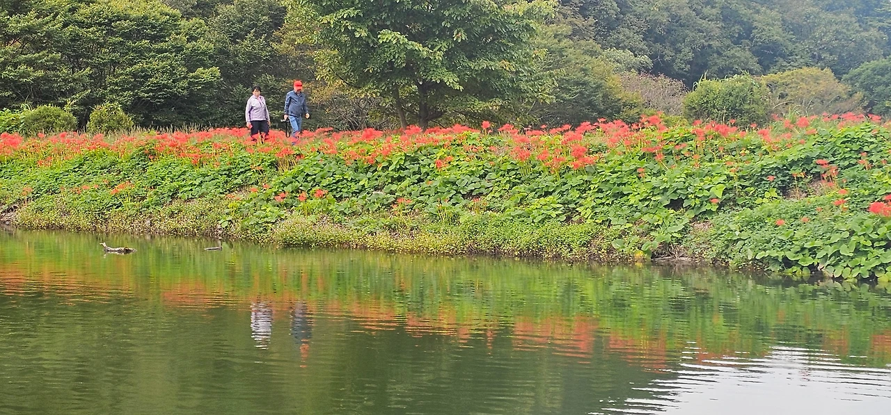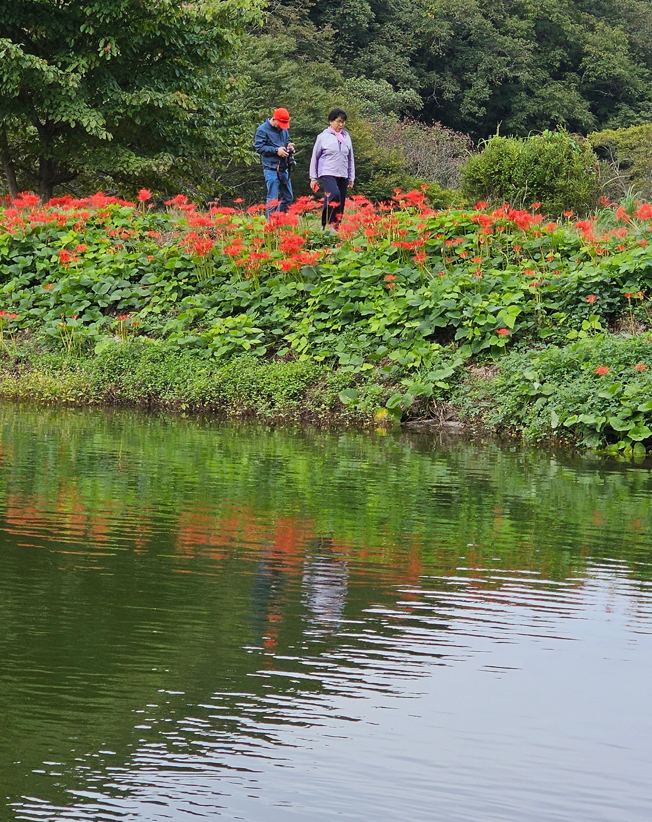 저수지 한 바퀴 돌고 내려오니 연못 속에 하늘과 산과 상사화, 그리고 노부부가 반영되어 있습니다.