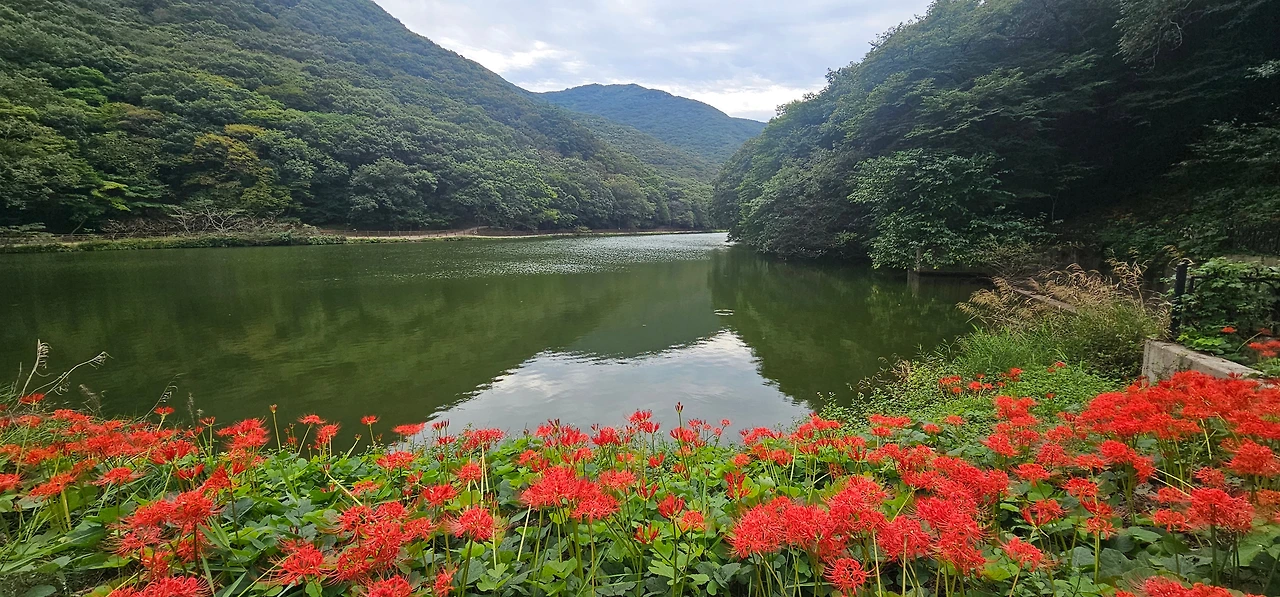 불갑저수지 이곳에 반영된 상사화를 찍는 것이 낙이었어요. 날씨가 흐려서 반영된 모습은 흐릿합니다.