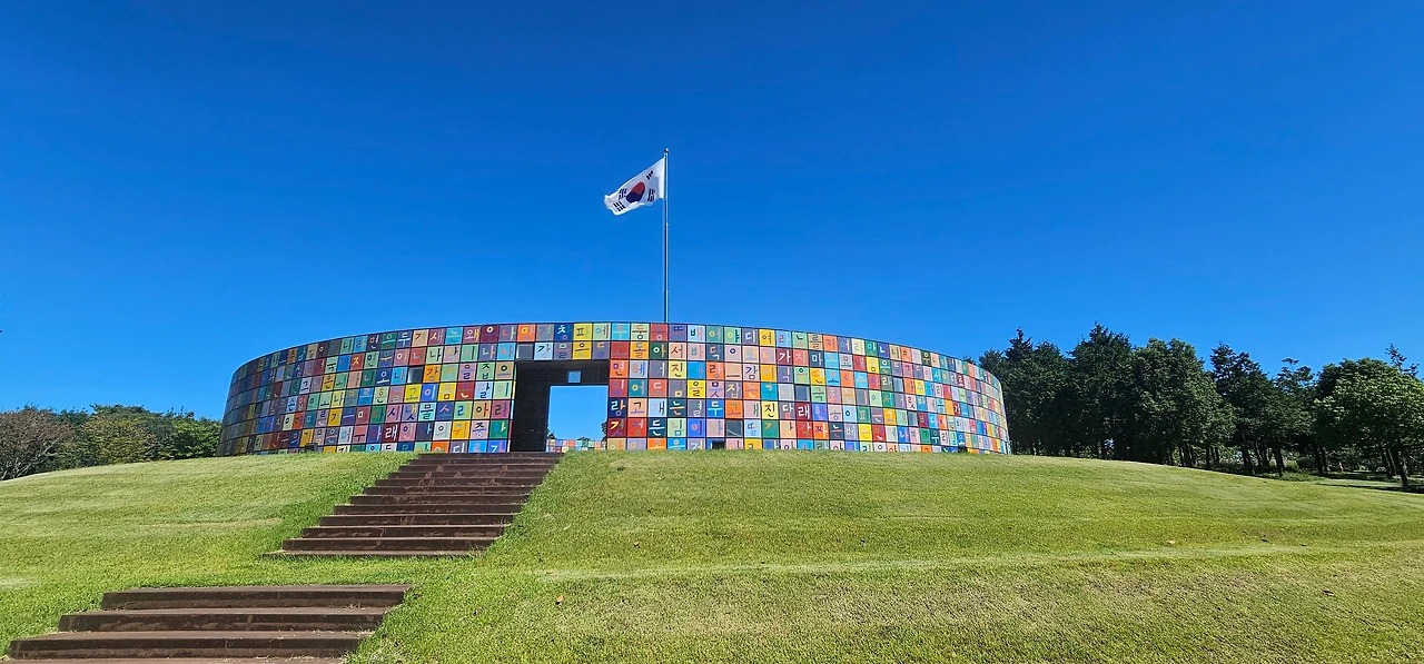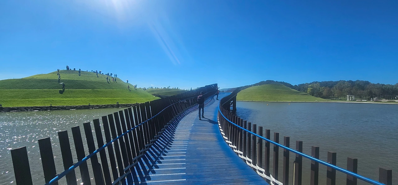 봉화언덕으로 가기 위해서 동천을 상징하는 다리를 건너갑니다. 강물이 흐르는 듯 물결치는 듯합니다. 색이 물색을 나타내는 푸른색이군요.