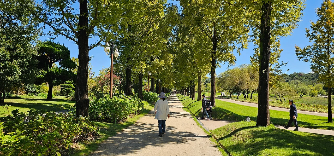 메타세쿼이아길은 시원시원함에 참 좋습니다. 하늘을 찌를 듯 쭉쭉 뻗은 나무들 그 아래 잔디와 뒤로는 푸른 하늘은 마음조차 시원해집니다.