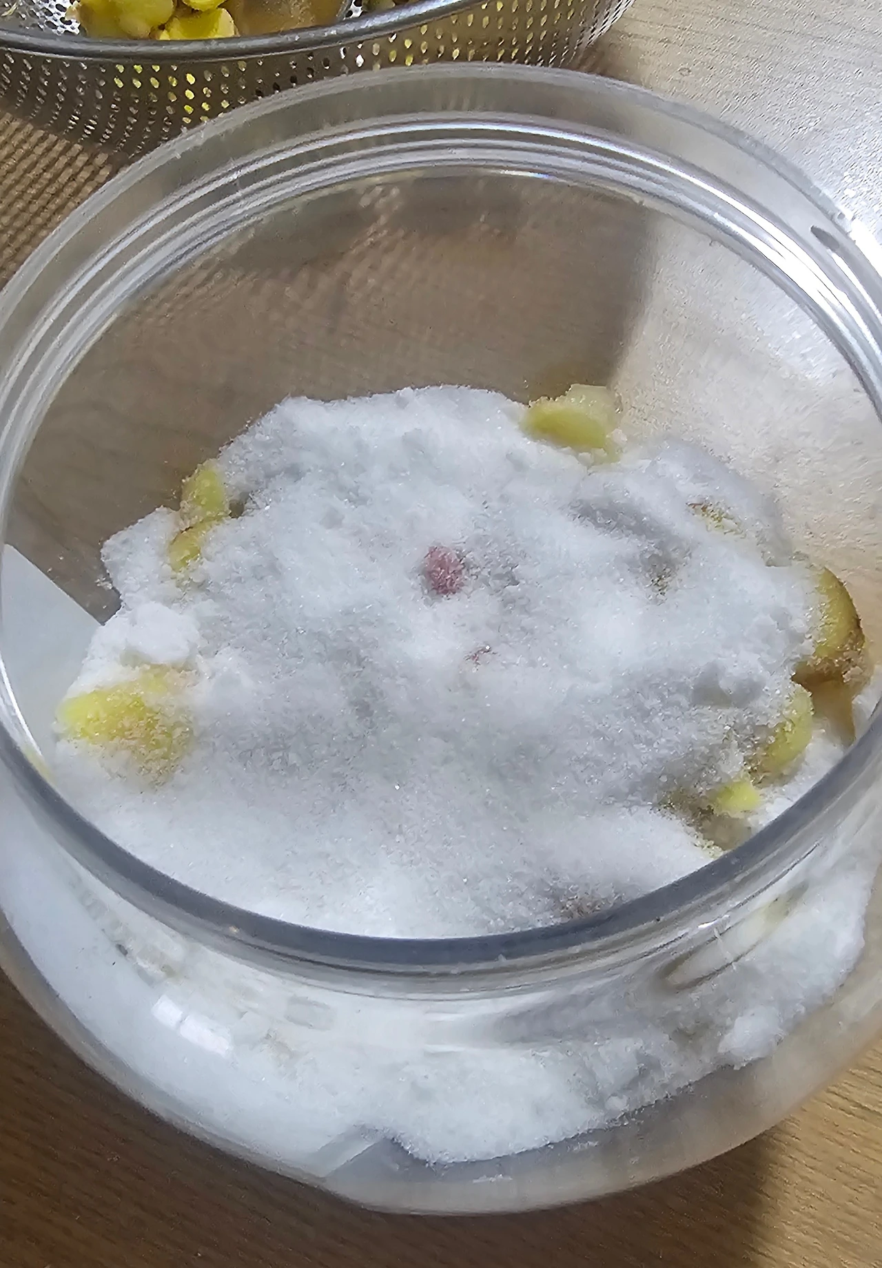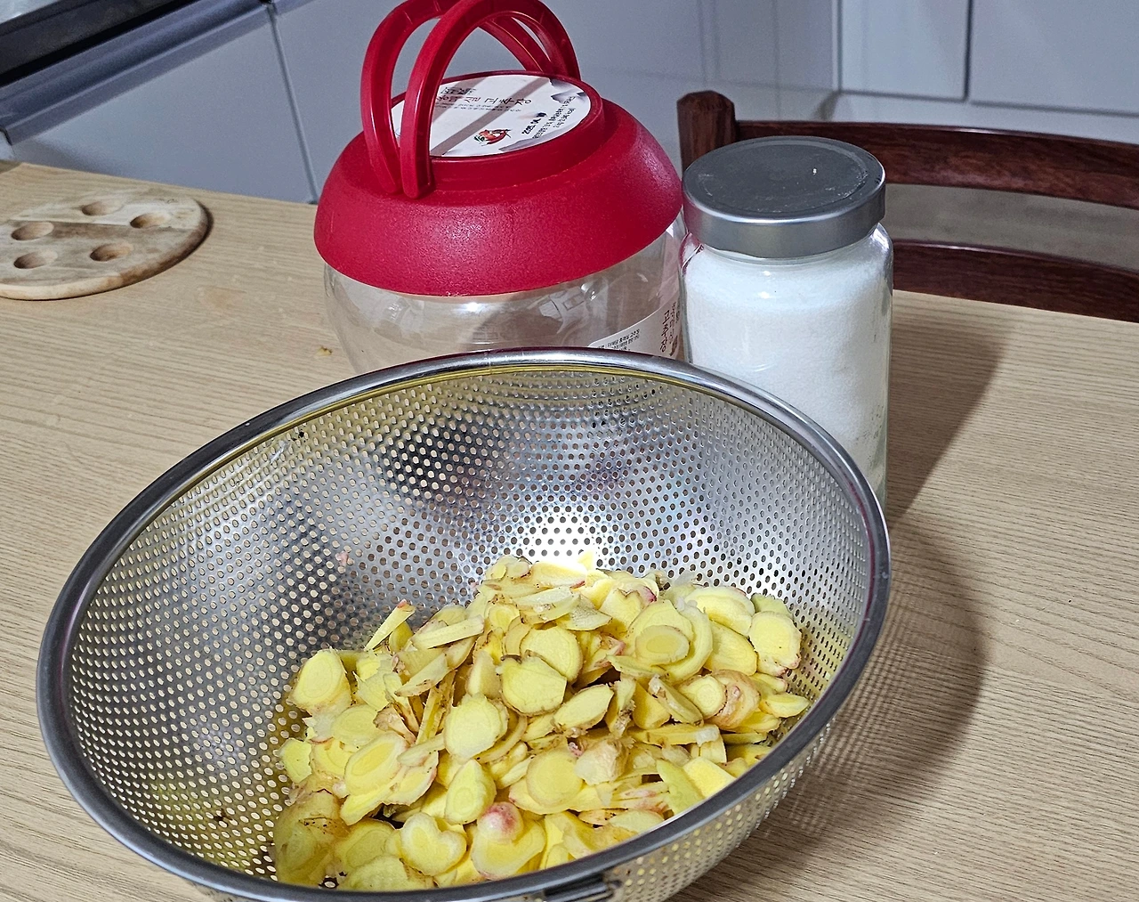 생강은 아린 맛이 있기에 설탕을 넣어 중화합니다.
