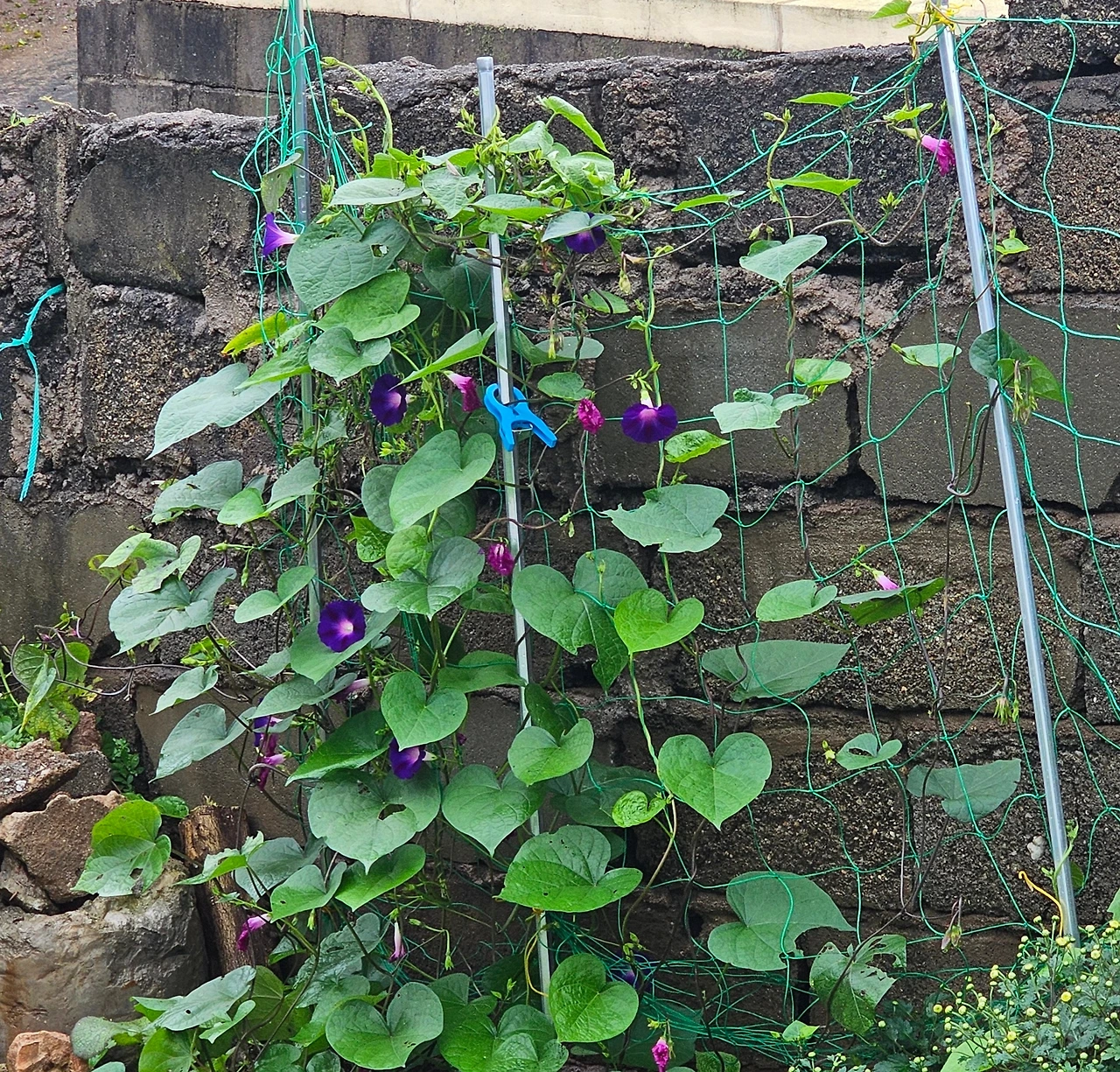 나팔꽃도 몇 그루 있습니다. 작년에 산책 갔을 때 너무 예쁜 보라꽃이 피어 있어 씨앗을 따 와서 텃밭 가장자리에 뿌려 두었는데 가을이 되어서 발아를 했네요. 처음에는 몇 포기 뽑아 버렸어요. 나팔꽃이 피고 나서야 그물을 쳤어요. 미리 잘 가꾸었다면 그물 가득 줄기를 타고 예쁜 꽃을 피웠을 것 같아요. 그러나 아침이 되면 10송이 정도의 나팔꽃 아가씨들이 나팔을 불고 있어요.