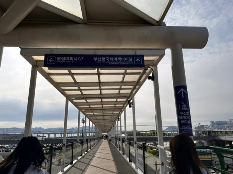 국제여객선터미널로 가는 육교국제선 터미널로 가는 길은 부산역사에 들어가서 건물의 맨 끝쪽문을 나가야 합니다. 부산역에서 국제여객선터미널까지 바로 이어지는 긴 육교가 있습니다. 군데군데 무빙워크도 있어요. 길도 깨끗해서 걷기를 좋아하는 우리는 참 좋습니다.