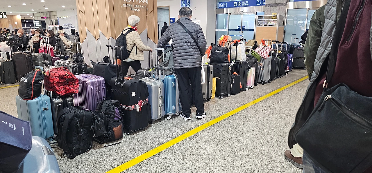 캐리어 줄이 깁니다. 이 짐이 순서가 된다 하네요. 우리는 일찍 들어왔기에 앞쪽에 배낭으로 줄을 세웠습니다.