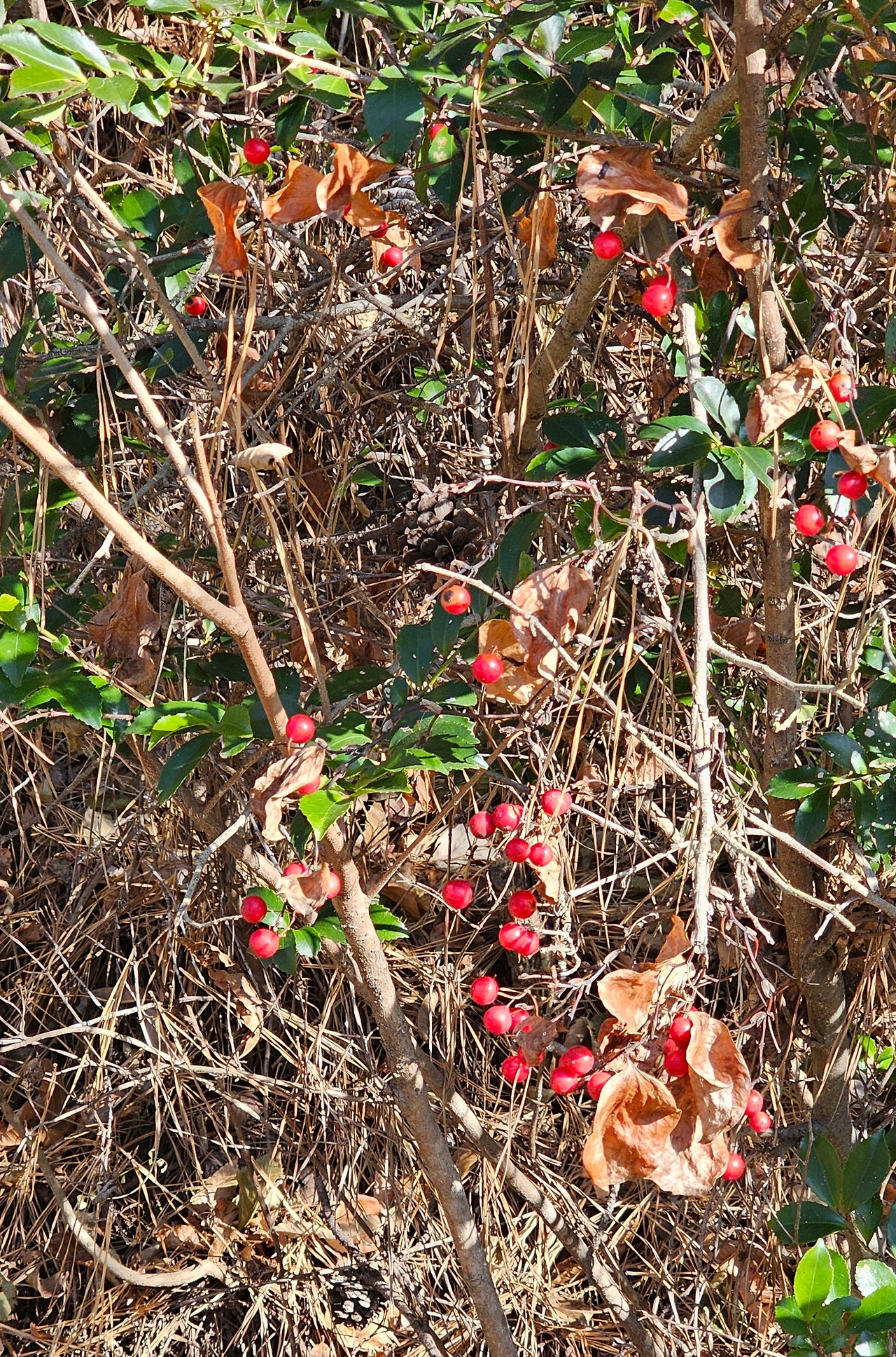 낙엽이 완전히 떨어진 나무사이로 작은 상록수들의 푸르름이 보인다. 망개도 붉은 보석알이다. 나무에 달려있던 잎새마저 완전히 떨어지고 나니 이제야 작지만 항상 푸른 이 나무들의 세상이다.