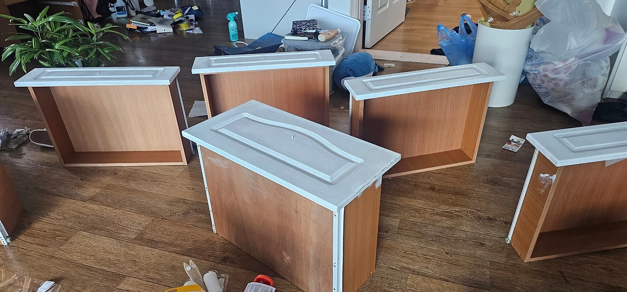 우리 부부는 귀촌을 하여 고흥에 살고 있고. 부산집은 딸이 살고 있습니다. 부산집에 있는 거실장은 수납공간이 좋고 튼튼합니다. 첫 번째 우리 집을 사고 마련한 가구입니다. 20년이 훌쩍 지났지만 쓸모가 좋아 버리지 않았는데 우리가 이사 가자마자 무늬목이 벗겨졌습니다. 오공본드로 붙여 너덜거리지는 않지만 낡은 모습이 조금 초라해졌습니다. 색깔도 딸의 취향이 아닙니다. 딸이 무늬목을 모두 벗겨내고 흰색 칠을 해보자 제안했습니다.