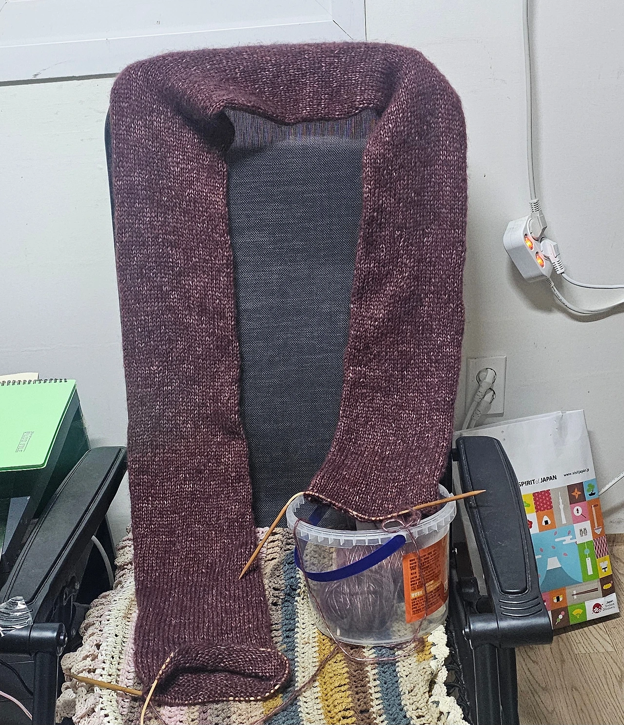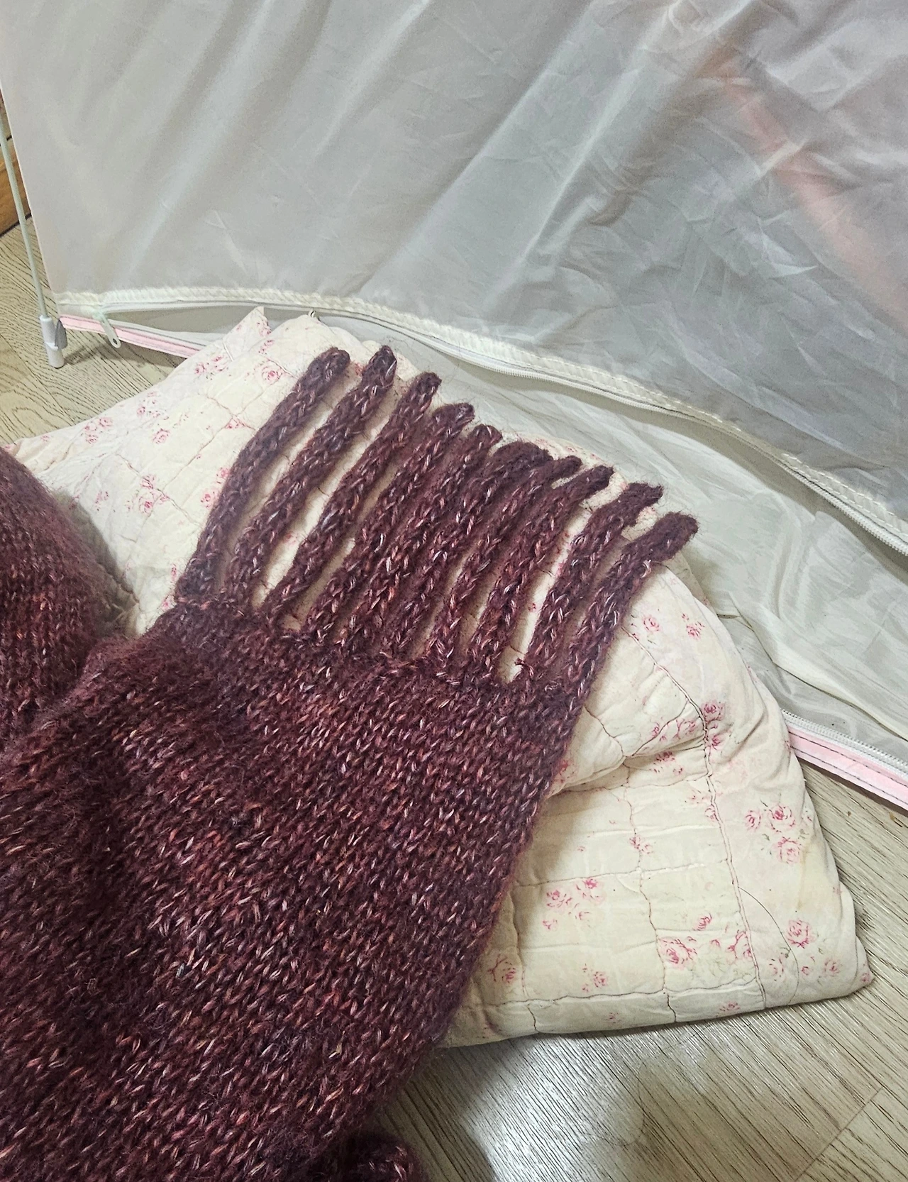 재미가 붙었고 솜씨도 늘어나고. 속도도 빨라졌어요. 베를린 스카프는 겉 뜨기를 무한반복하니 그리 어렵지는 않았어요. 5일째 되는 날. 2m 완성했어요.