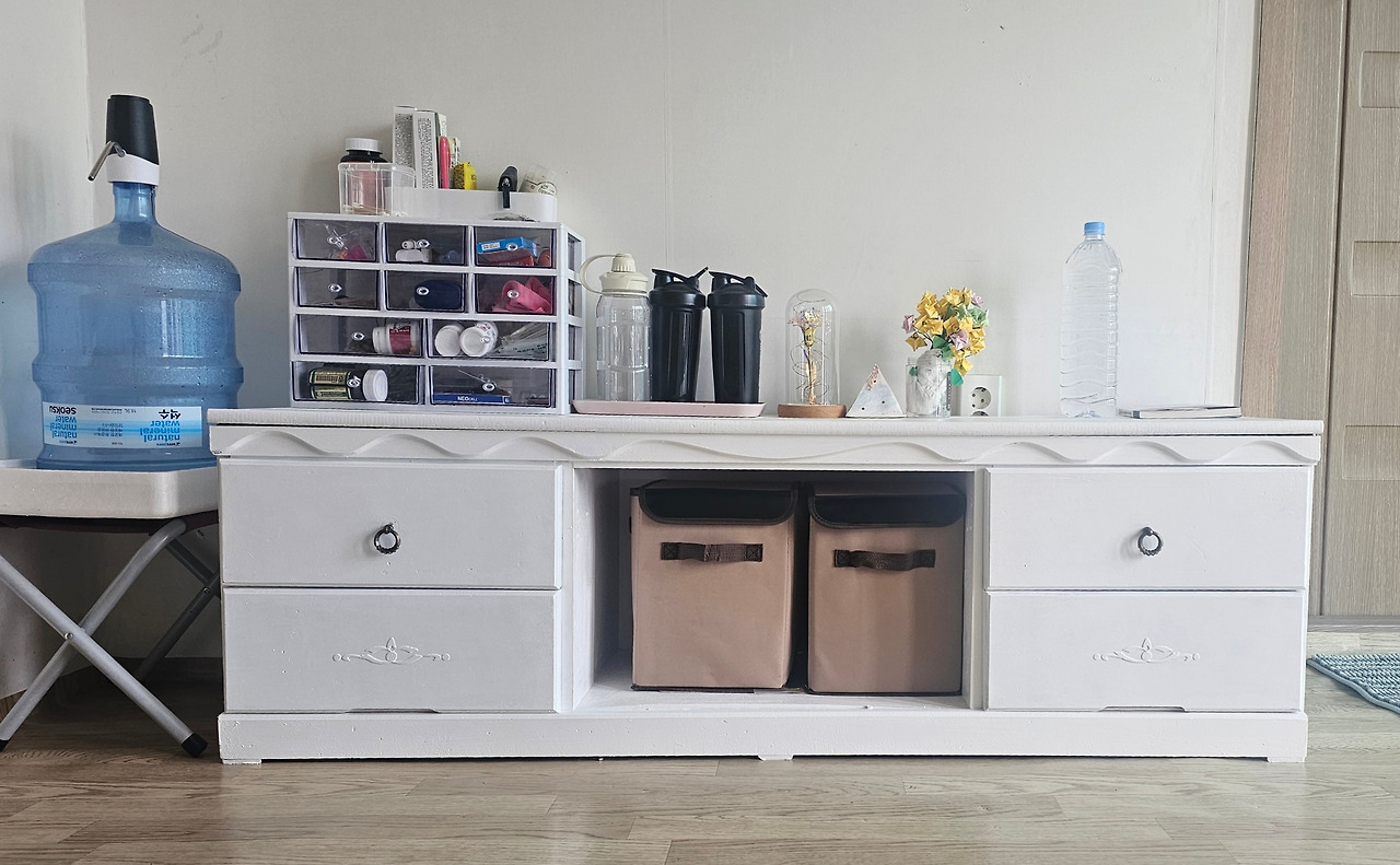 거실장은 바로 거실에 배치를 했습니다. 그전보다는 훨씬 정돈되었습니다. 아들이 마실 물 한병, 물통들도 가져가기 쉽게 둡니다.