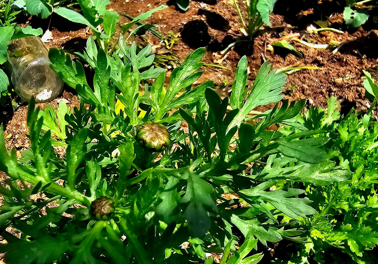 어제는 비가 와서 쑥갓은 따지 않았나 보다. 오늘 아침 요즘 심은 모종의 상태를 살피러 갔다가 보았다. 쑥갓에 꽃봉오리가 달려 있었다. 그제는 분명 없었는데 언제 저렇게 자랐나?