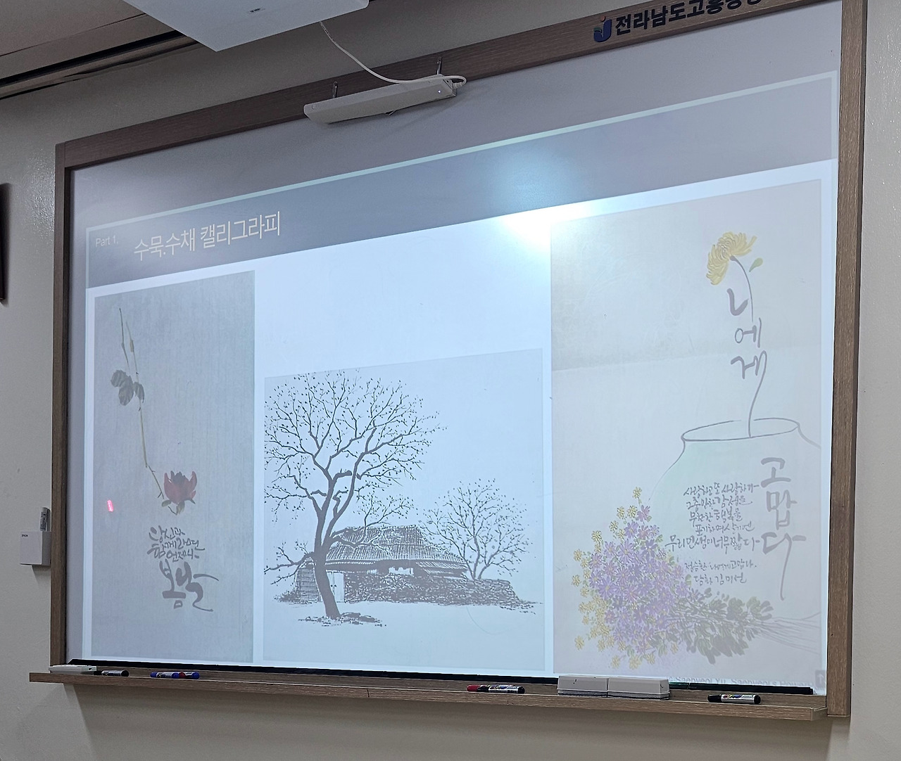 오후 7시 두 번째 강의인 캘리그래피입니다. 붓펜으로 하는 취미반 정도로 생각했는데 먹과 붓을 사용하여 수묵화 문인화 포토샵까지 곁들인다는 전문가 수준의 학습이 이루어지겠네요.
