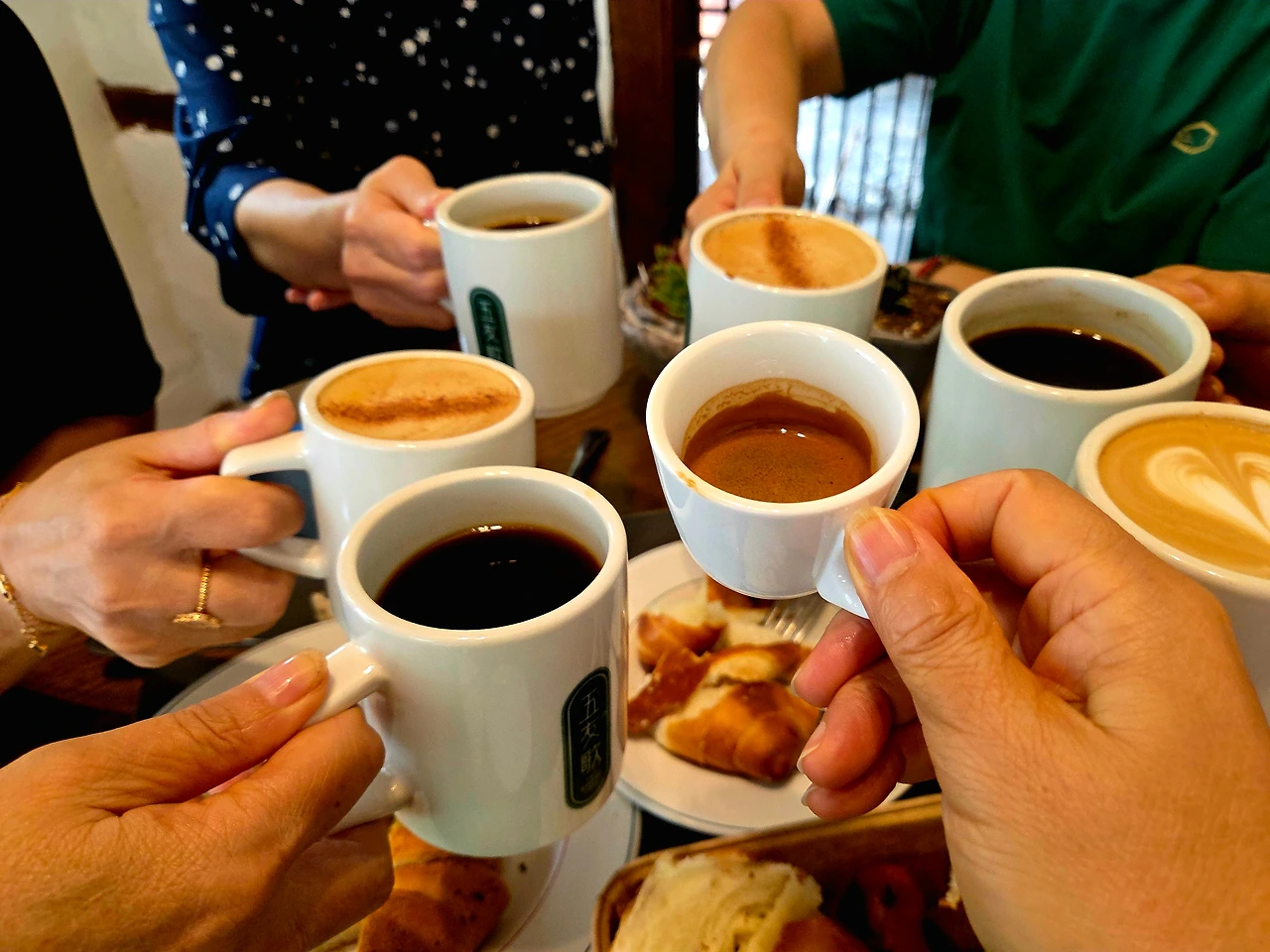 ​점심 식사 후, 병원 진료로 인해 한 친구가 먼저 자리를 떠났지만, 남은 친구들과 함께 **'오우가'**라는 카페에 갔습니다. 마당의 작은 수로와 대나무들이 도심 속 카페를 감싸고 있어 인상적이었습니다. 신나는 수다는 종일 계속되었고, 배가 너무 불러 견디지 못하고 산책에 나섰습니다.