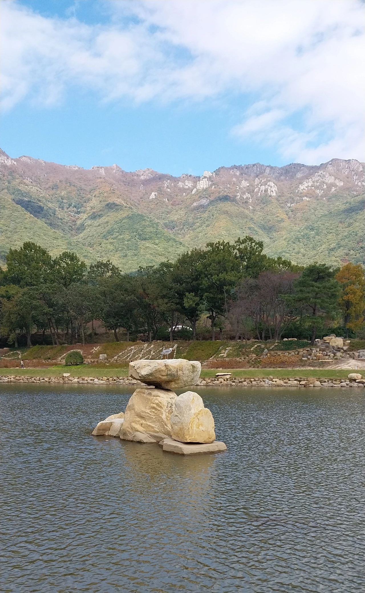 회색빛 새 한마리가 주인인양 바위에 앉아서 우리가 호수가를 갈 때부터 떠나올 때까지 그대로 앉아 반겨주었습니다. 새로 생겨 호수는 아직 어색하지만 영축산이 병풍처럼 둘러싸고 있고 멀리 보이는 하북면 일대가 한눈에 보이는 명당자리였습니다.