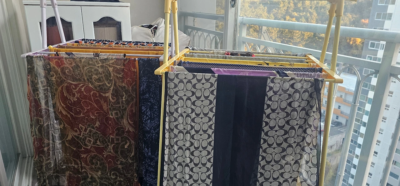 분명 버리지 않았는데 아무리 찾아도 보이지 않는 스카프도 있으니, 아마 집 어딘가에 꼭꼭 숨어 있을 테지요. 빨래 건조대에 빼곡하게 널린 스카프들을 보니, 문득 깨닫습니다. 이 많은 스카프, 주로 내 것이로군요!