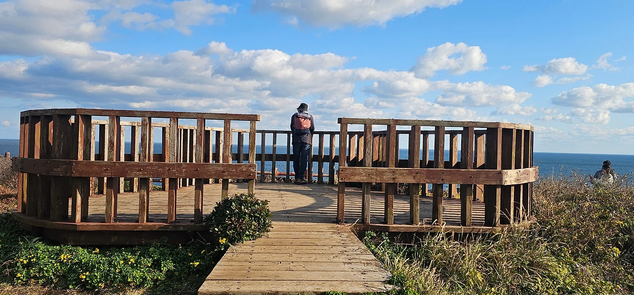 마지막 데크에서 바다와 하늘을 다시 한번 보고 돌아오는 길, 넓은 잔디밭에 앉아 휴식을 취했습니다. 부부가 나란히 한 곳을 보며 앉으니, 최근 겪었던 갈등이 해소되고 한마음이 된 듯한 기분이 들어 더욱 뜻깊었습니다.