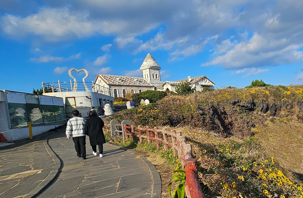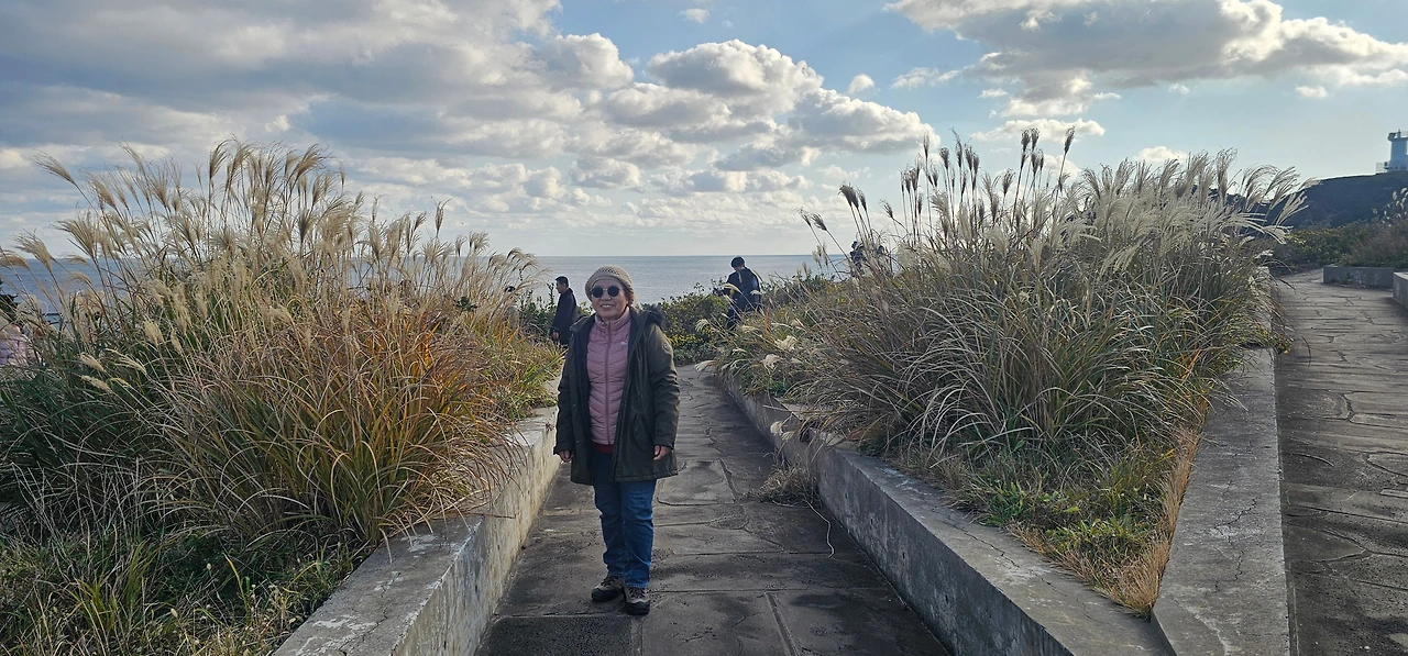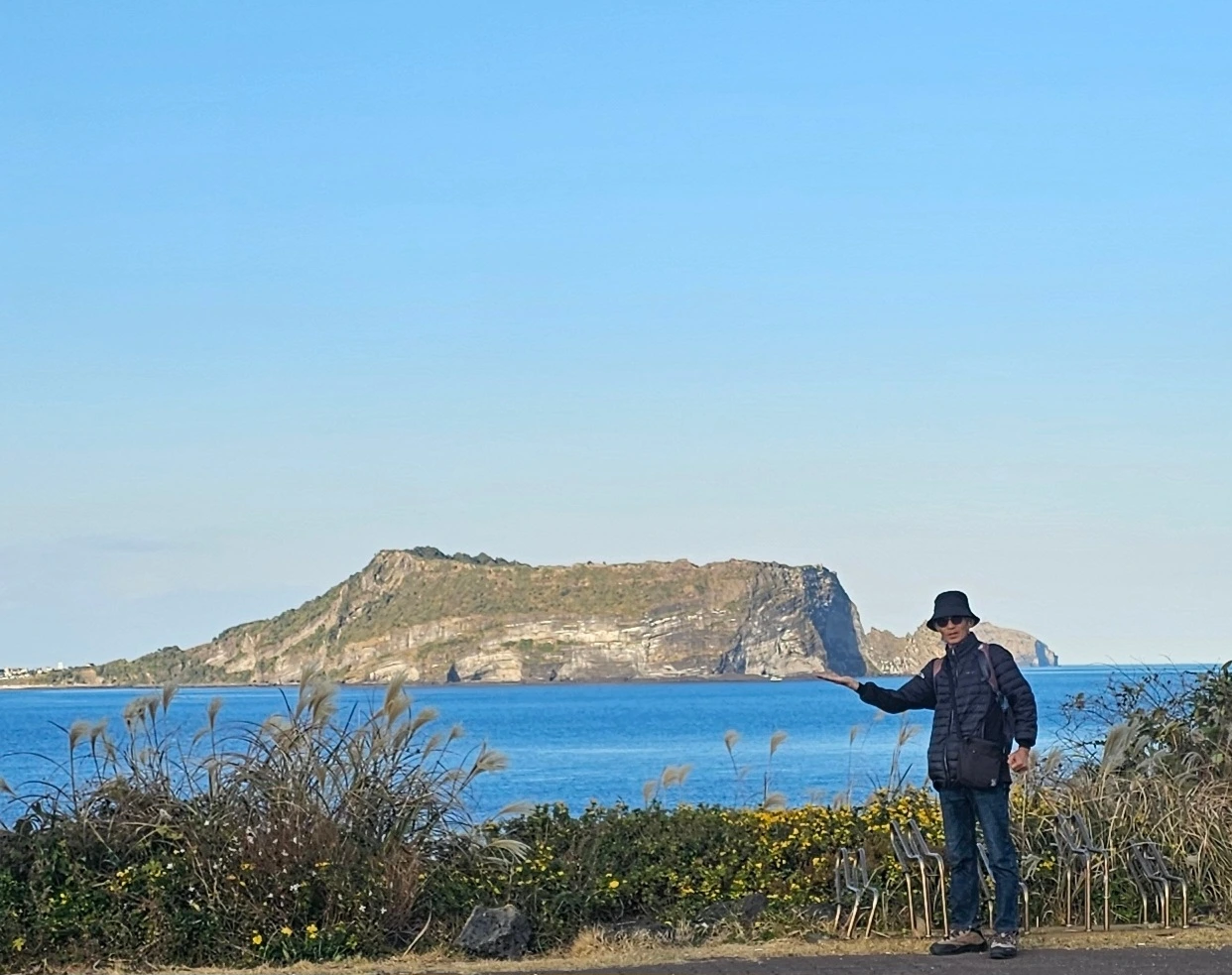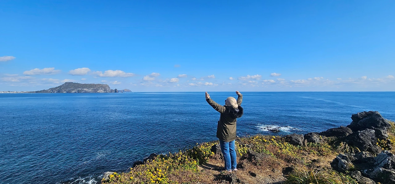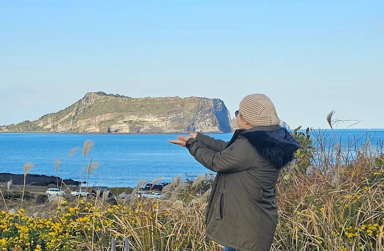 섭지코지의 아름다움은 끝이 없었습니다. 육지에서 보았던 썰렁한 나목들과 달리, 이곳은 섬 전체를 수놓은 노란 감국과 보랏빛 해국이 눈을 즐겁게 했으며, 아직 마르지 않은 하얀 억새들도 싱그러움을 더했습니다.