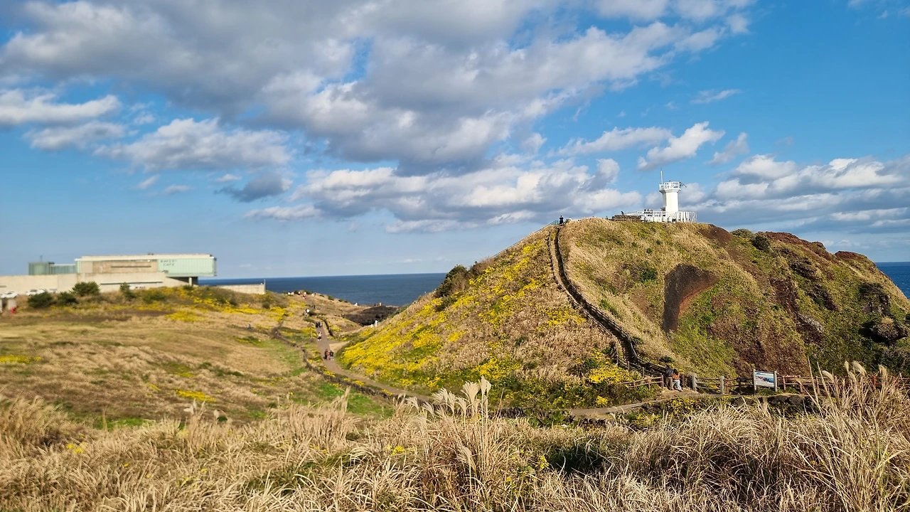 파노라마 절경: 눈앞에는 성산일출봉의 웅장한 모습과 소의 머리인듯한 우도의 기암괴석이 파노라마처럼 펼쳐졌습니다.