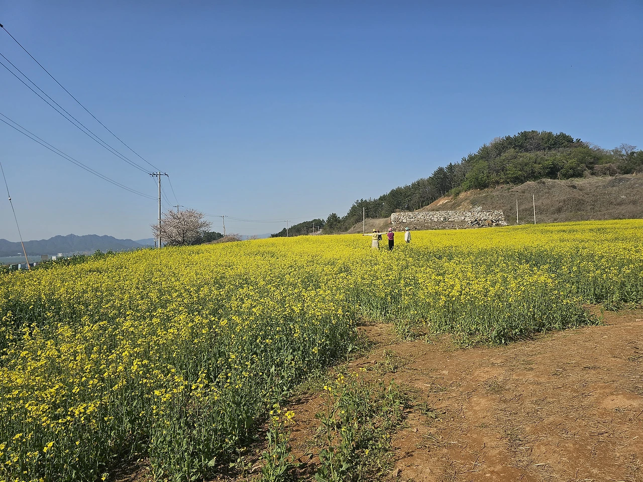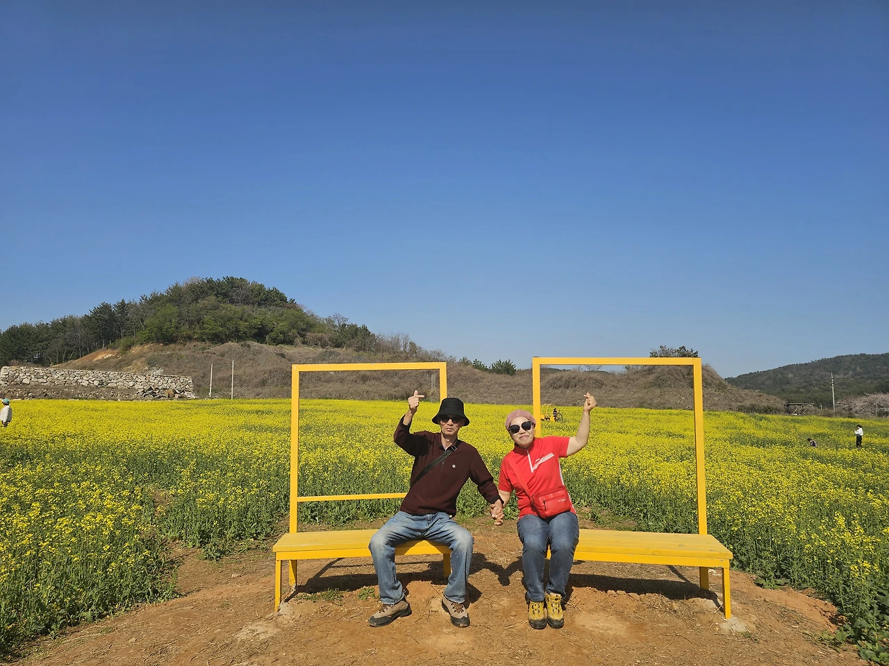 이제 유채밭으로 갑니다. 앞서 찍은 젊은이들은 표정도 다양하고 포즈도 다양한데 우리는 매번 같은 포즈를 할까요, 젊은이들은 한 의자는 비우고 가까이 앉았는데 우리는 이것이 편합니다.