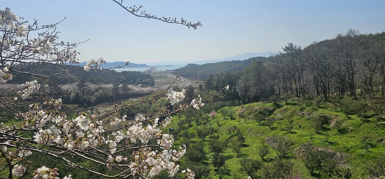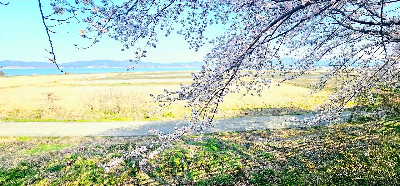 긴 벚꽃나무 길 너머로 고흥만이 해살을 받아 유난히 반짝이는 은빛 윤슬을 만들고 있습니다.