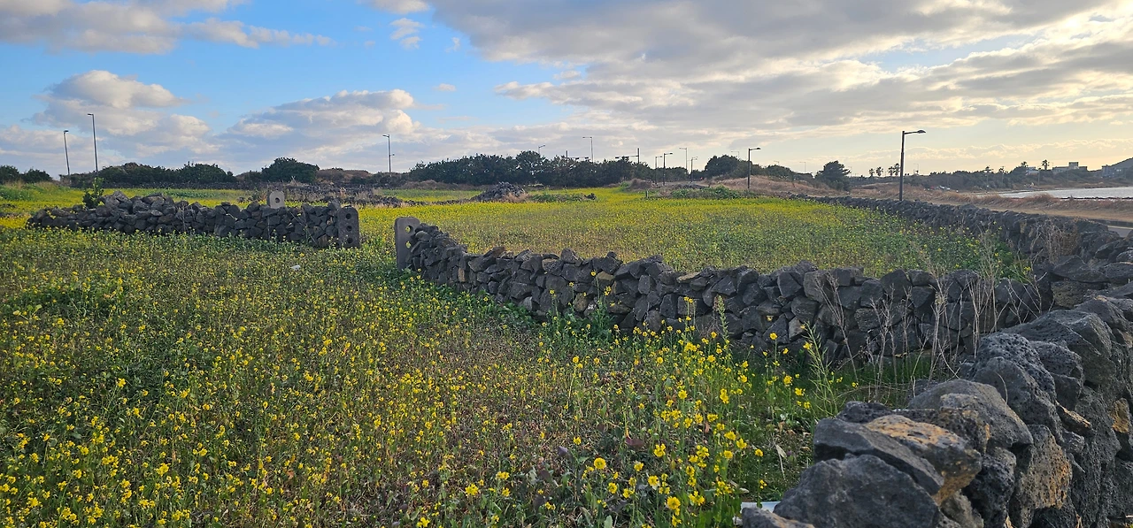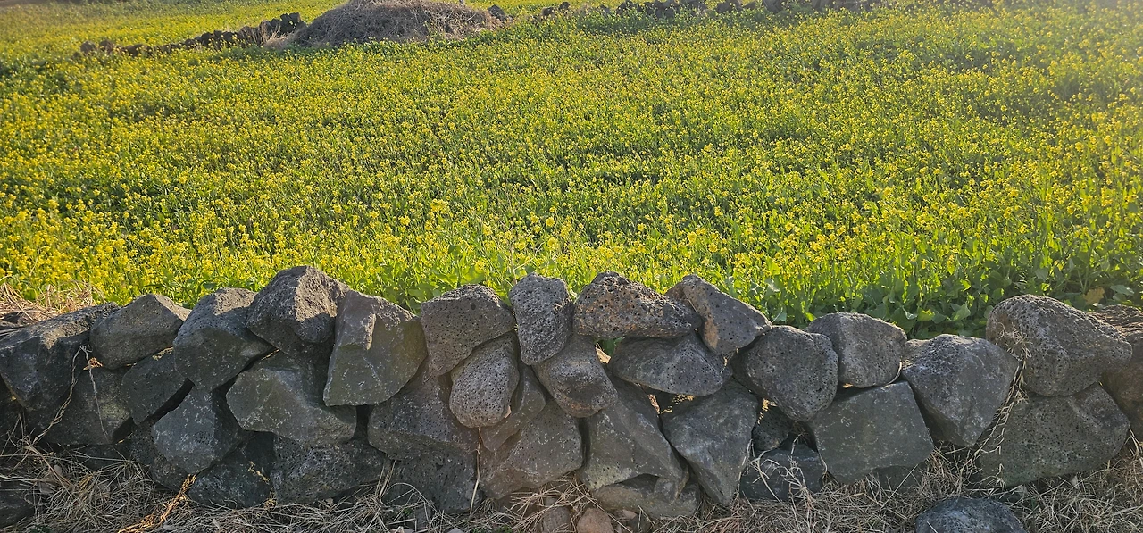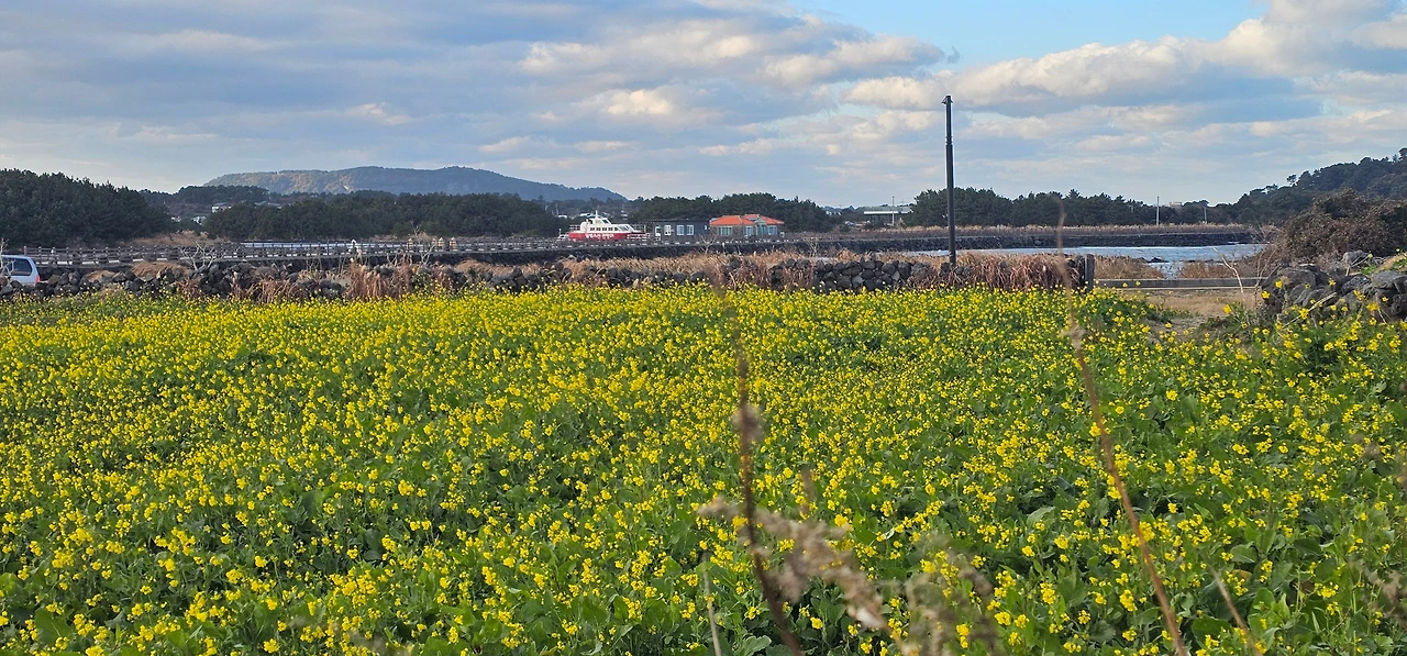아직 키는 작지만, 수줍게 고개를 내민 노란 꽃들이 환한 미소로 반겨줍니다. 유채밭을 두른 검은 돌담 너머로 바다와 한라산이 한눈에 들어오는 곳인데, 아쉽게도 오늘 한라산은 구름 뒤에 몸을 숨겼습니다.